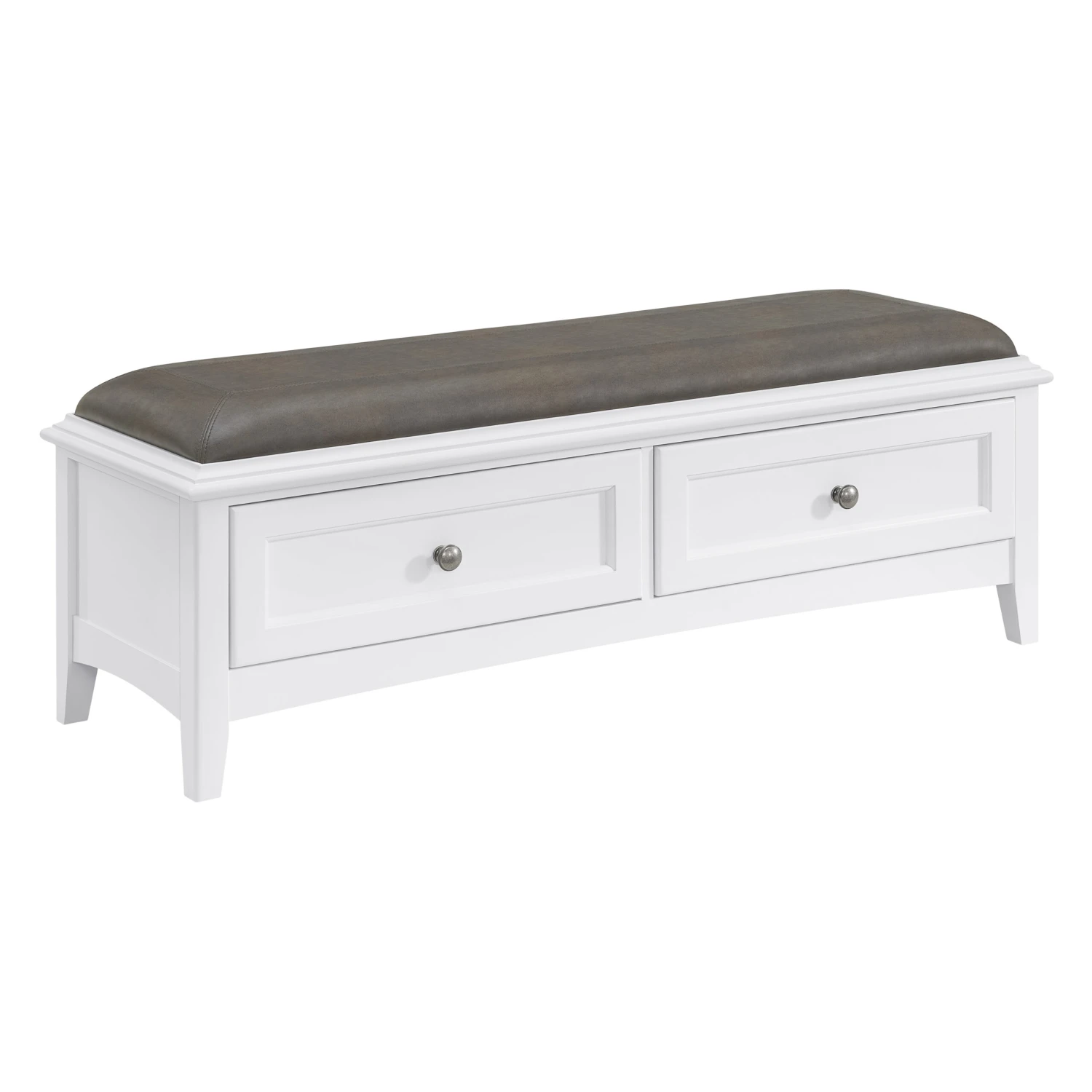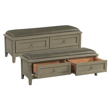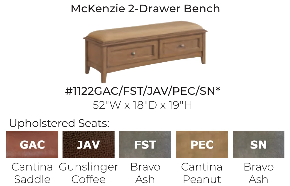 The beautiful McKenzie Bench is perfect to place at the end of the bed for concealed storage. Whisper quiet, full extension metal ball bearing drawer slides provide maximum access to the two spacious drawers. Additionally, mortise and tenon joinery and a fitted back ensure structural strength and stability. The upholstered seating surface is made from comfortable, bonded, cushioned leather. The McKenzie Bench is currently available in six different finish and cushion options: Glazed Antique Cherry (Cantina Saddle), Caffe (Gunslinger Coffee), Java (Gunslinger Coffee), Pecan (Cantina Peanut), and Snowbound (Bravo Ash)or Fieldstone (Bravo Ash). Pair this bench with any of the pieces in the McKenzie Bedroom Collection to create a cohesive look.