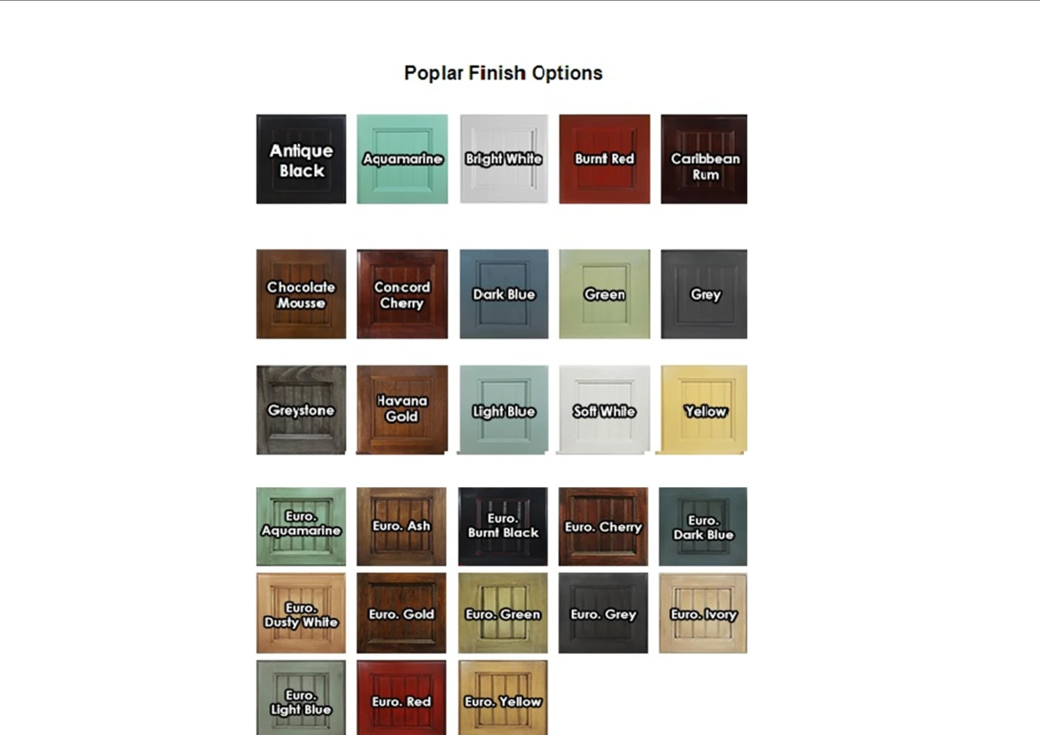 - Light Distressed Finishes: Antique Black, Chocolate Mousse, Havana Gold, Aquamarine, Concord Cherry, Light Blue, Bright White, Dark Blue, Soft White, Burnt Red, Green, Yellow, Caribbean Rum, Grey