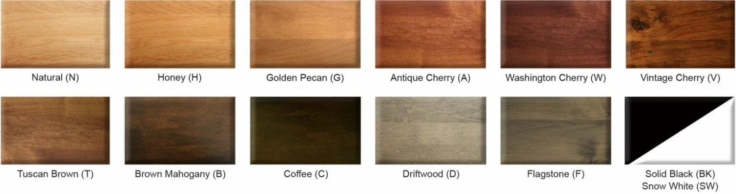 - Stain Options: Flagstone(F), Vintage Cherry (V), Washington Cherry (W), Tuscan Brown(T), Brown Mahogany (B), Coffee (C), Antique Cherry (A), Driftwood (D), Golden Pecan (G), Honey (H), Natural (N)