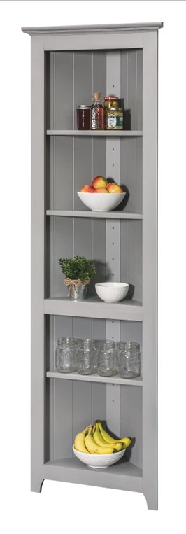 Part of the Pantries and Cabinets Collection ,this Pine Open Corner Shelf provides the perfect addition to any room. The 3 adjustable shelves and one fixed shelf create a layered display area where you can showcase photos, decorations, gaming consoles, and much more. The Open Corner Shelf ships fully assembled and is available unfinished or Amish finished in your choice of 12 matte paint finishes and 1 gloss finish. Combine this versatile piece with any home decor and in any room in your home. It works perfectly for smaller areas and provides a unique and efficient solution for your concealed storage needs