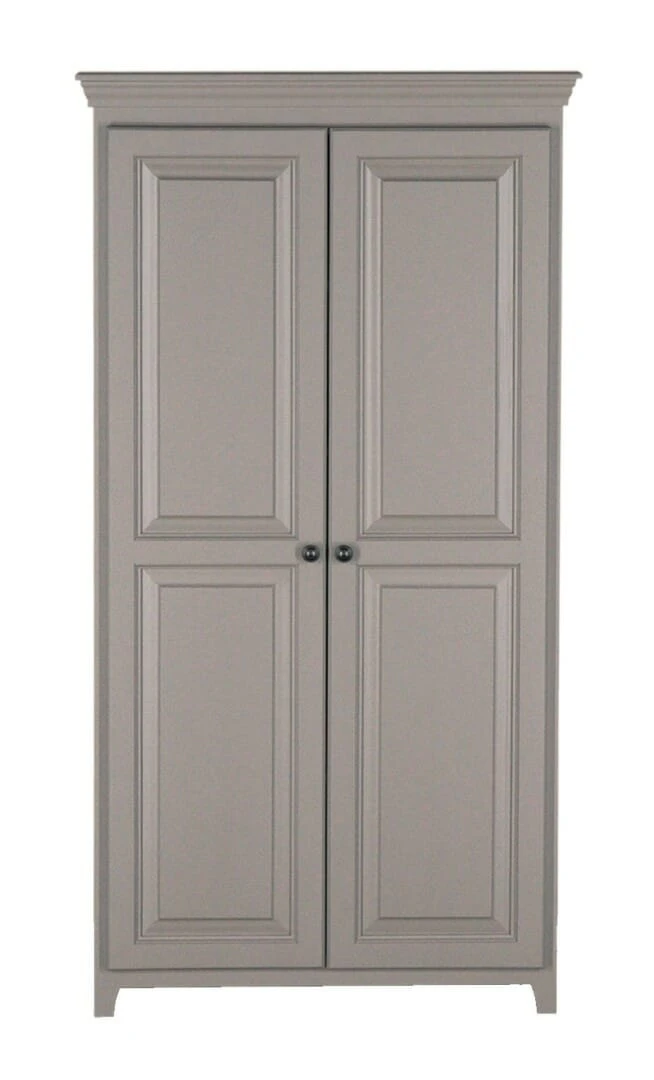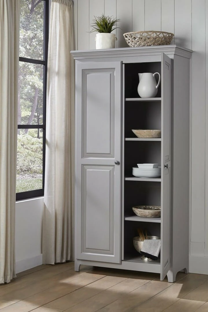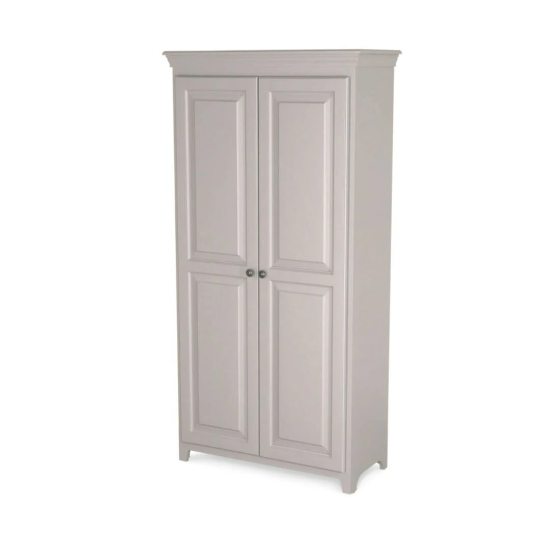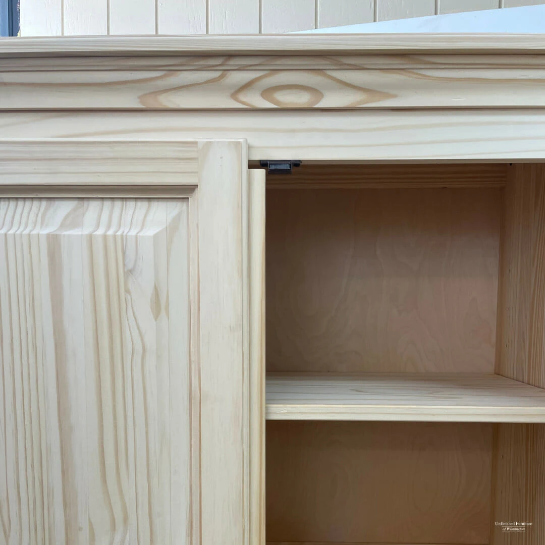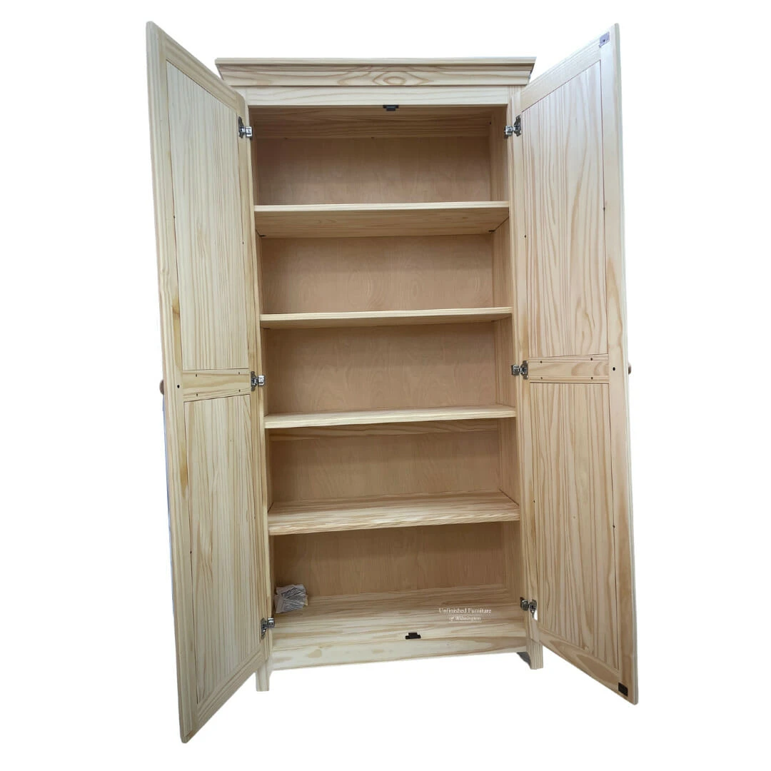 Part of the Pantries and Cabinets Collection, this Pine Two Door Pantry provides the perfect addition to any room. This unit includes four adjustable shelves behind the two solid wood doors. This cabinet features updated European Concealed hinges with luxurious soft close functionality. It ships fully assembled and is available unfinished or Amish finished in your choice of 12 matte paint finishes and 1 gloss finish. Further customize this piece with your choice of 7 knobs. Combine this versatile piece with any home decor and in any room in your home. It works perfectly for smaller areas and provides a unique and efficient solution for your concealed storage needs.
