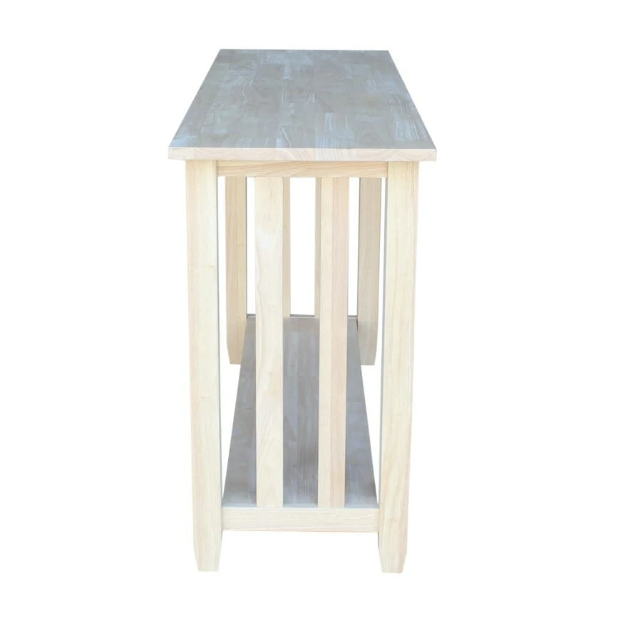 The Mission Sofa Table provides simplicity and versatility with its clean lines and classic design. The distinctive Mission style slats on the sides and a narrow, lower shelf offer style and function. The lower shelf can be used for storage or as a place to display your favorite items. The Mission style legs offer additional interest. This table looks great when paired with other Mission-style furniture, but can also be used with any other style. The Mission Sofa Table ships unfinished, but can also be easily stained or painted to match your existing furniture. It is made from solid, eco-friendly Parawood in order to ensure strength and durability. To view several finishing tutorials, visit General Finishes‘ website.