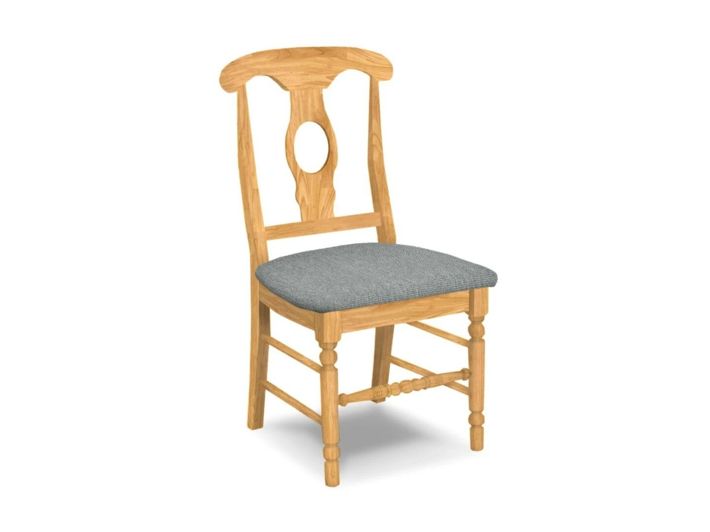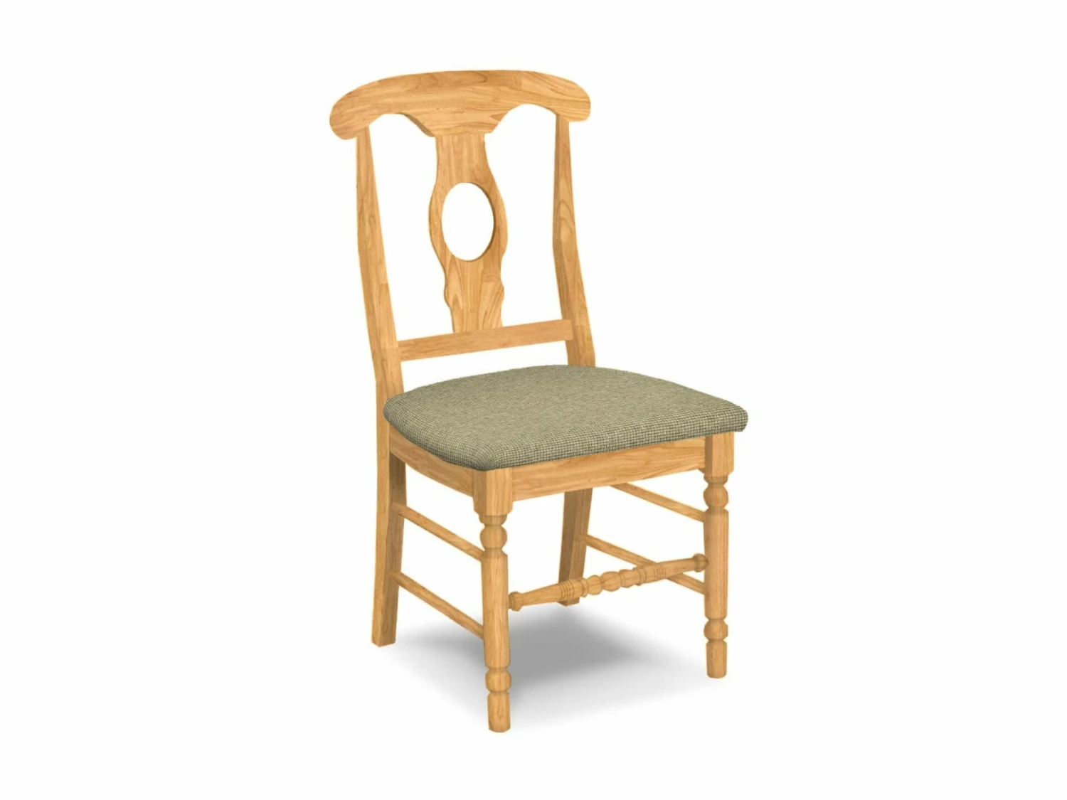 The Upholstered Empire Chair offers eye-catching details that will make a statement in any kitchen or dining space. It has a Napoleon-style back, with two side stretchers running from the front to the back post. It also features a turned front leg. The Empire chair is made from solid, eco-friendly Parawood in order to ensure maximum strength and durability. Furthermore, the leg stretchers are both screwed and glued in place to protect your chair from strenuous and everyday use. This chair is available unfinished with your choice of several fabric options. The picture gallery allows viewing of several fabrics on the chair. Click here to view additional fabric options: Standard Fabric Options. This chair is also available with a standard wood seat: Empire Chair. It ships in a set of 2; however, single chairs are available for purchase at our retail store.