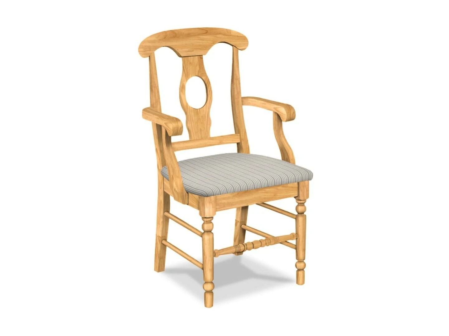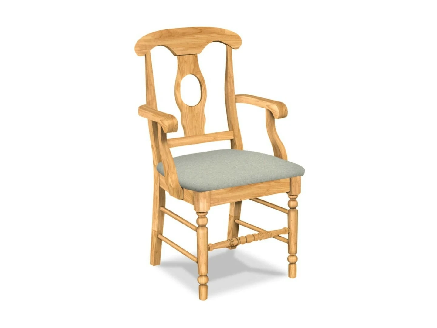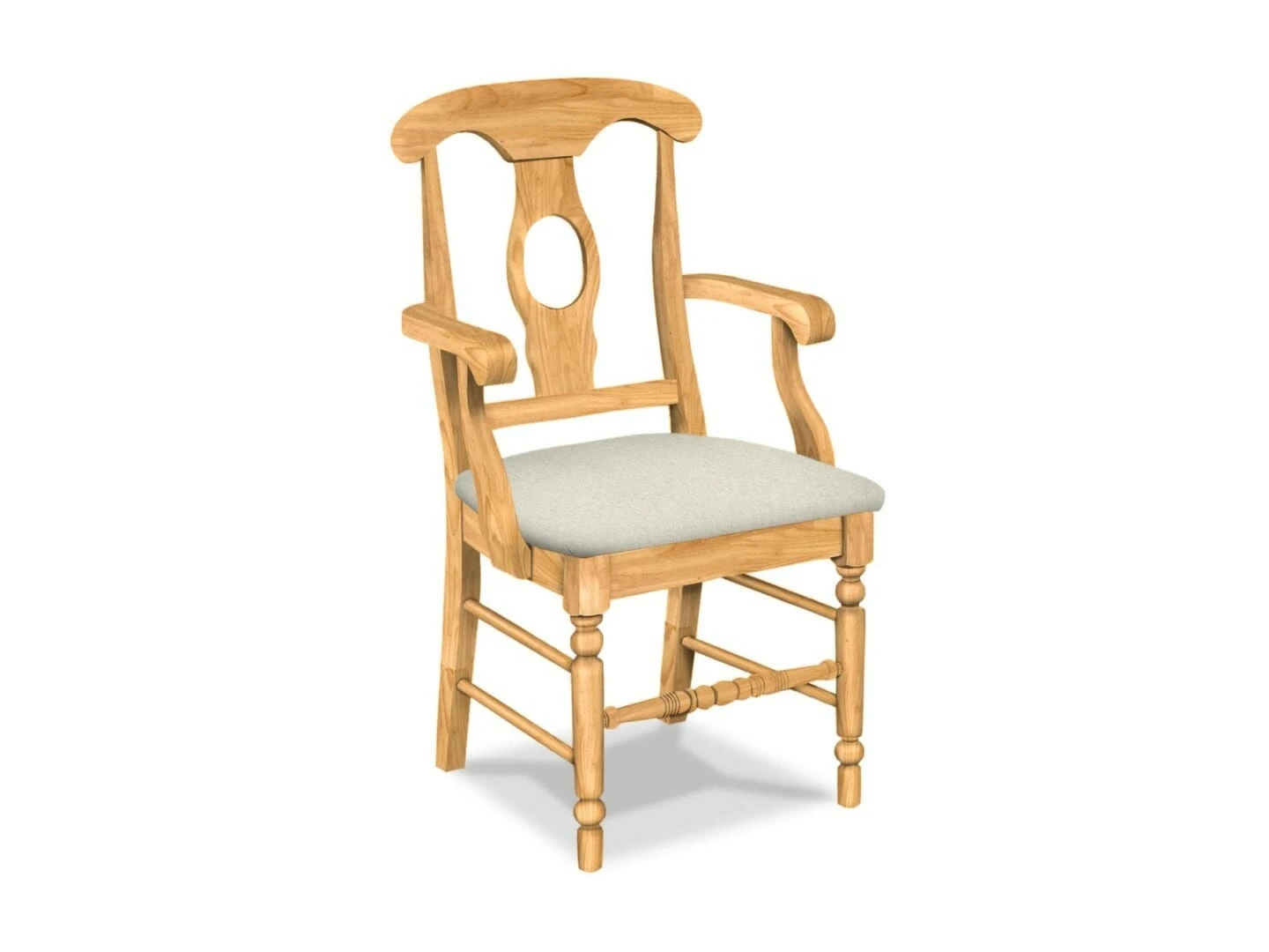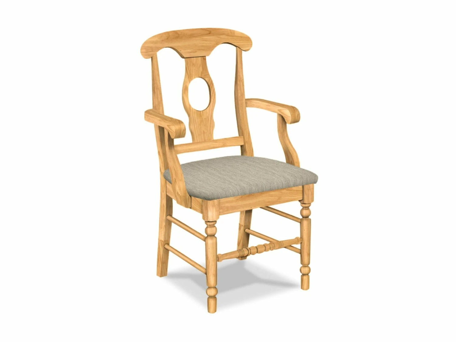 The Upholstered Empire Arm Chair offers eye-catching details that will make a statement in any kitchen or dining space. It has a Napoleon-style back, with two side stretchers running from the front to the back post. It also features a turned front leg. The Empire chair is made from solid, eco-friendly Parawood in order to ensure maximum strength and durability. Furthermore, the leg stretchers are both screwed and glued in place to protect your chair from strenuous and everyday use. This arm chair is available unfinished with your choice of several fabric options. The picture gallery allows viewing of several fabrics on the chair. Click here to view additional fabric options: Standard Fabric Options. This chair is also available with a standard wood seat (Empire Arm Chair) and without arms (Empire Chair).