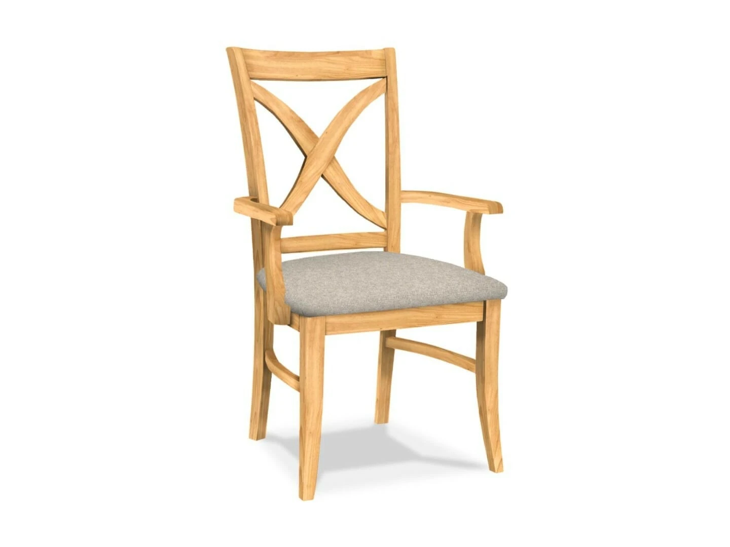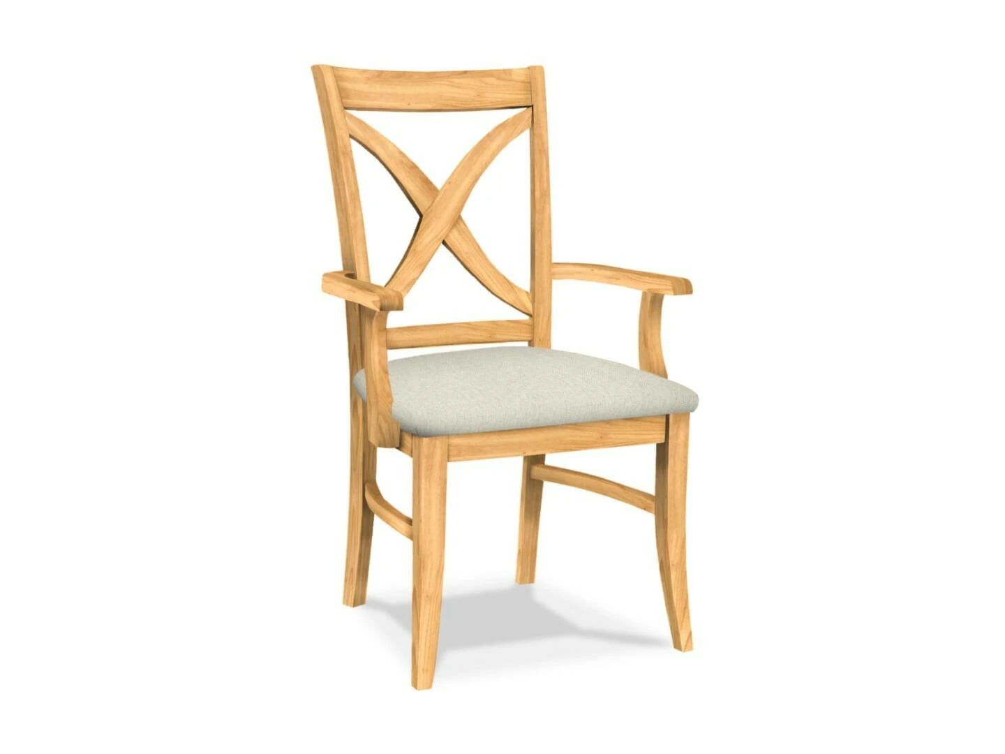The C-14AB Vineyard Arm Chair feature a gentle, curved X back and a slight curve on the front legs. This eye-catching design is both versatile and comfortable and provides an elegant look for your dining space. Additional support is offered by the sturdy side arms. The Vineyard arm chair is made from solid, eco-friendly Parawood in order to ensure maximum strength and durability. Furthermore, the stretchers are both screwed and glued in place to protect your chair from strenuous and everyday use. The Vineyard arm chair is available unfinished with your choice of several fabric options. The picture gallery allows viewing of several fabrics on the chair. Click here to view additional fabric options: Standard Fabric Options. This chair is also available with a standard wood seat: Vineyard Arm Chair.