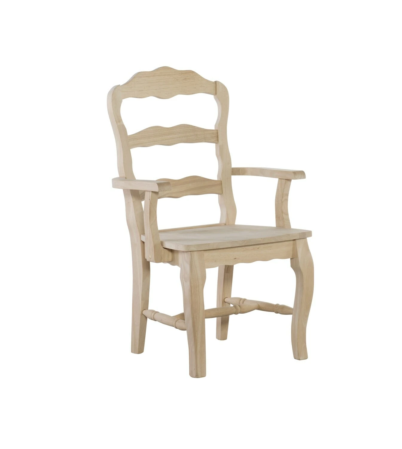 The Versailles Chair is a French Bordeaux-style chair with country French front legs and a scalloped skirt. It has a wide, thick back that offers additional comfort and support. The subtle elegance of this chair works well in a formal dining space or to dress up your casual kitchen. The Versailles chair is made from solid, eco-friendly Parawood in order to ensure maximum strength and durability. Furthermore, the leg stretchers are both screwed and glued in place to protect your chair from strenuous and everyday use. This chair is available unfinished, but can be easily stained or painted to match your existing furniture. This chair is the same version of our Versailles Chair with the addition of side arms.