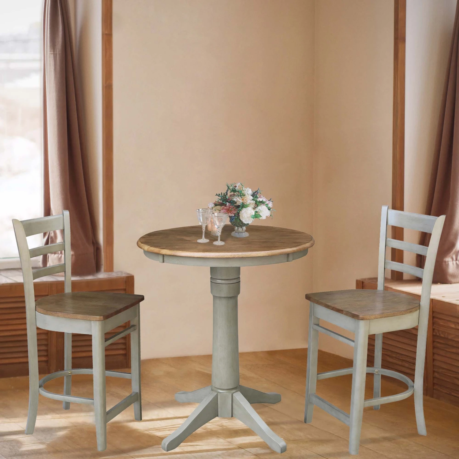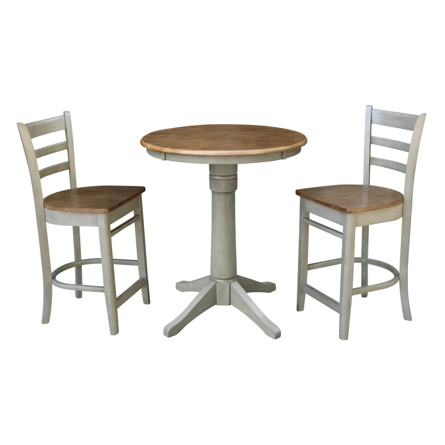 The Round Pedestal Table stands at gathering height of 36″ tall. It includes a pedestal base with four feet for maximum support. This table works perfectly in a smaller space including an apartment or urban loft. It includes two Emily Stools with supportive backs and wide seats for extra comfort. The stools have a clean look to it with straight square edge cross members and vertical slats on the back. In this set, the base of the table and the frame of the stools ship factory finished in a Stone color. The solid wood table top and the seats of the stools ship finished in a distressed Hickory. In addition, this cozy set, made from eco-friendly Parawood, comfortably seats two adults. Additional stools are also available for separate purchase.