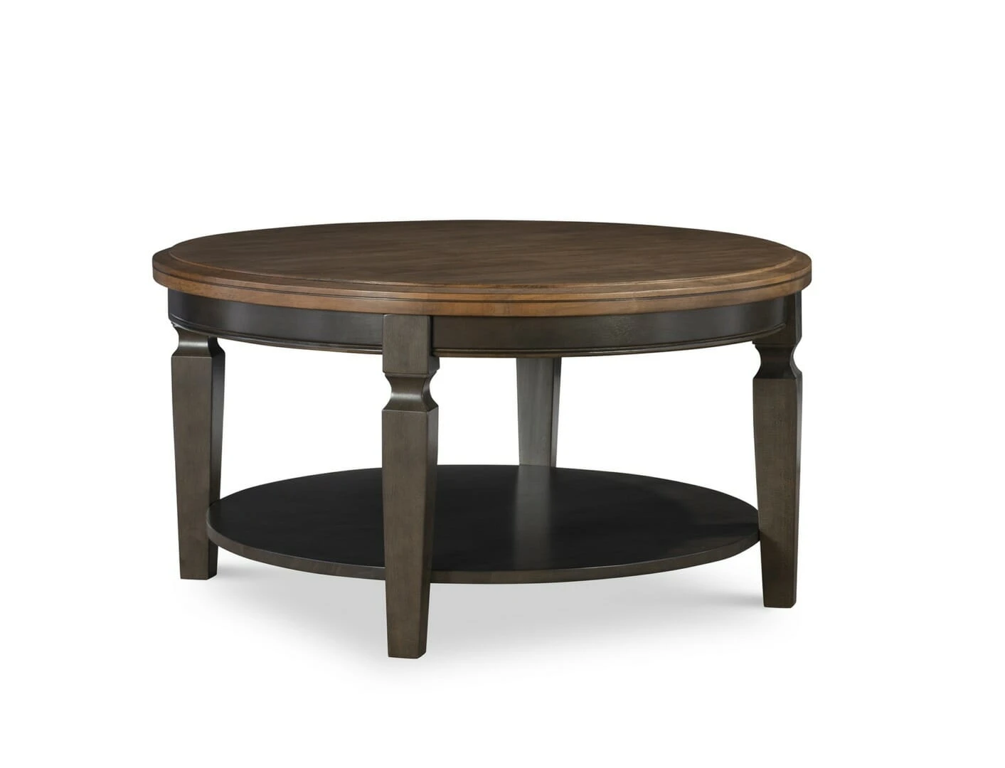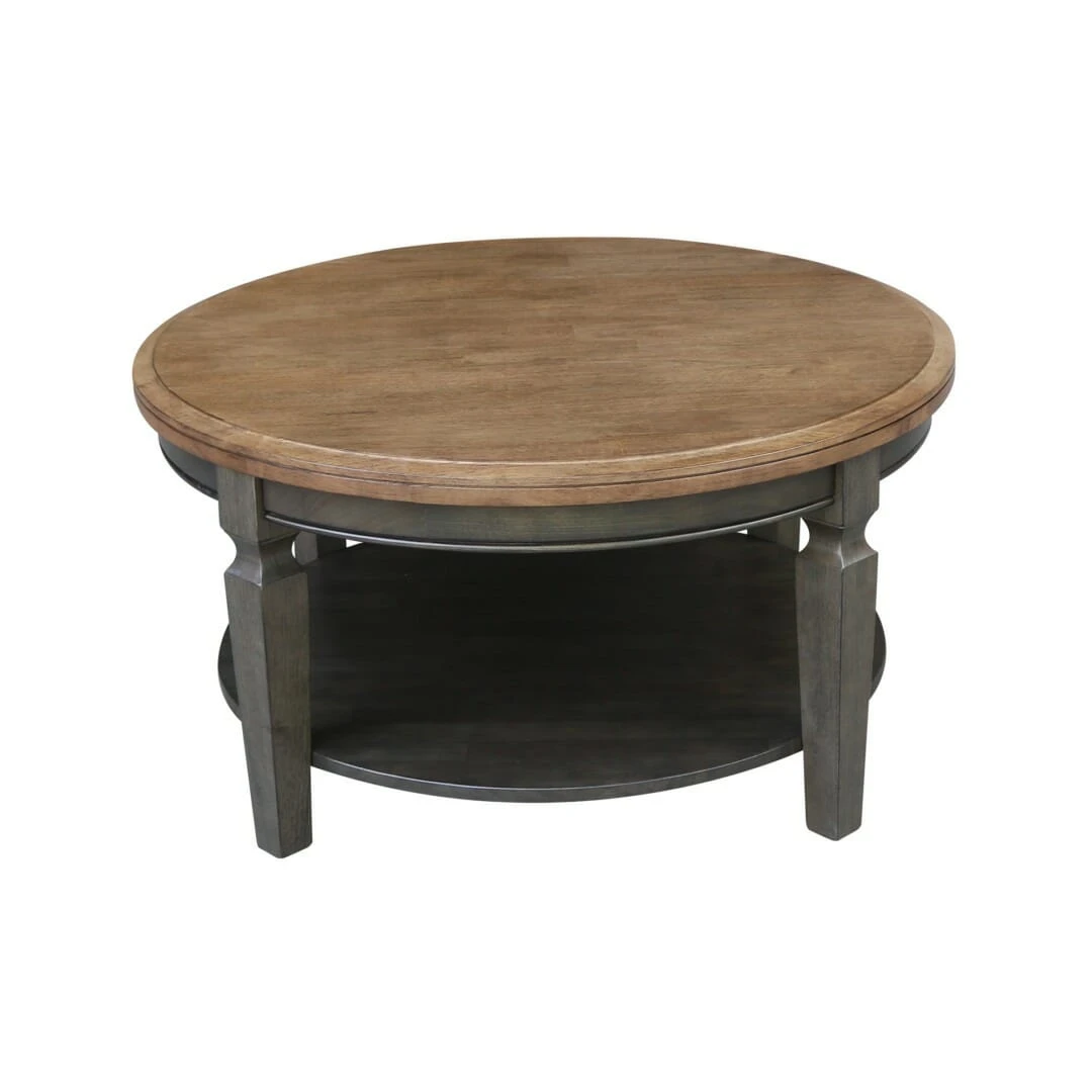 The OT-15CR Vista Round Coffee Table matches the other pieces in the Vista Collection. This collection features modestly ornate lines, offering a timeless and classic look. It is available unfinished or in your choice of two-tone finishes. The top is finished in a distressed Hickory stain, while the legs and skirt are available in Stone, Coal, or a distressed Shell finish. Enjoy the fine craftsmanship of John Thomas with a coffee table that is beautifully made, long-lasting, and affordable.