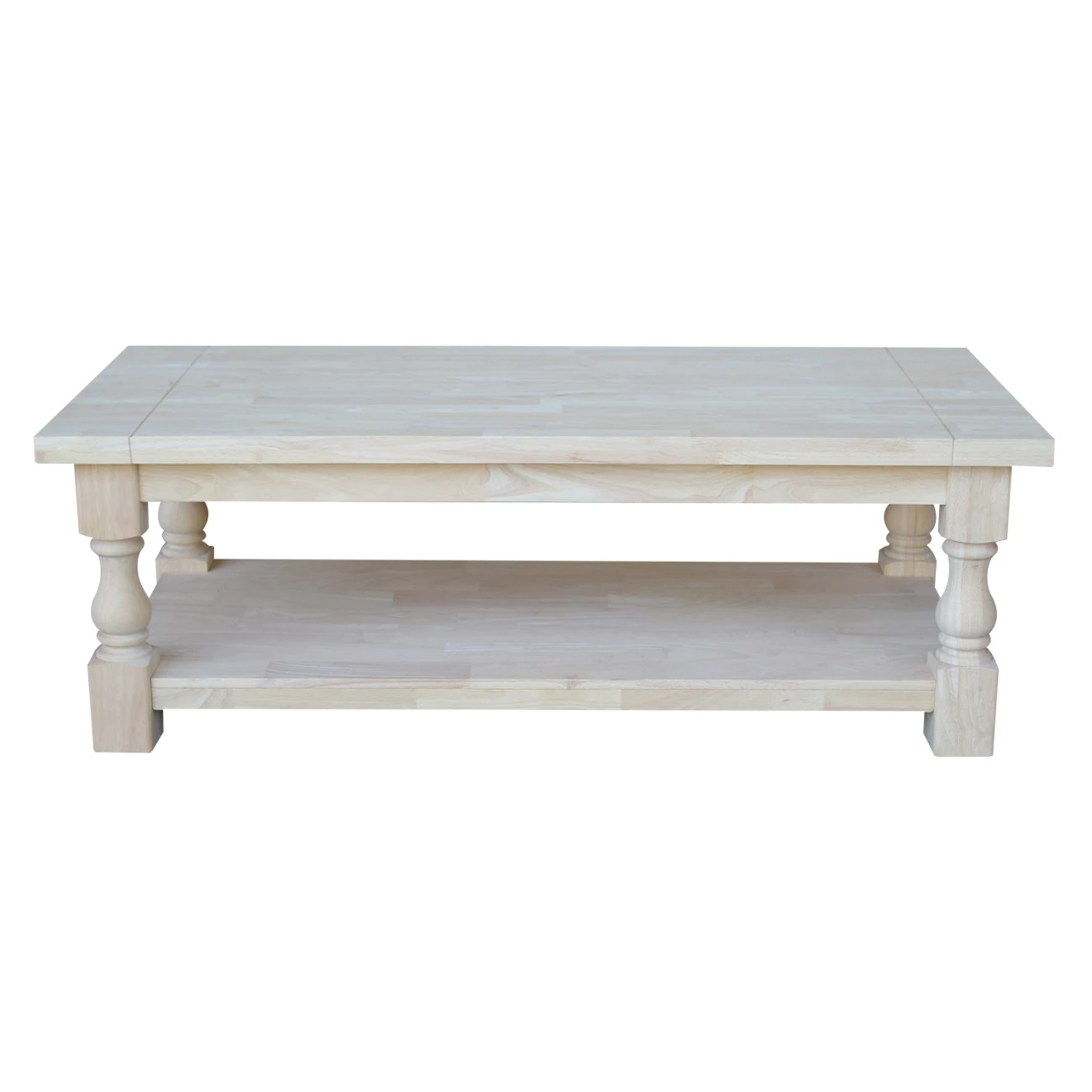 The large, grand Tuscan Coffee Table makes a bold statement in your living room. The thick top adds a sense of scale not found in many other tables. The design and scale of this table offers an eye catching appeal. The lower shelf is the perfect spot for you to place a basket or other large items that need to be easily accessible. Made from solid, eco-friendly Parawood, this table offers maximum strength and durability. The Tuscan coffee table ships unfinished only, but can be easily stained or painted to match your existing furniture.