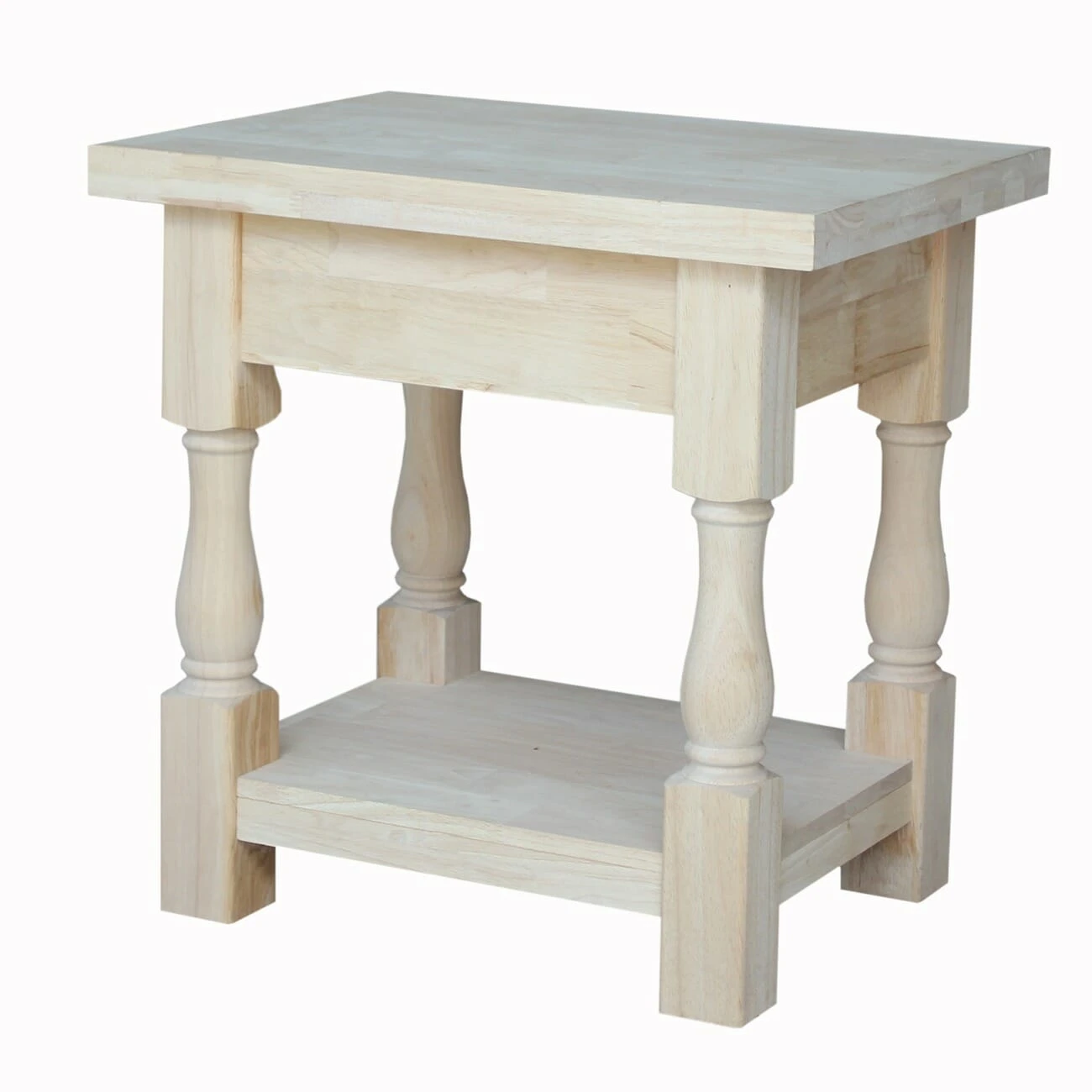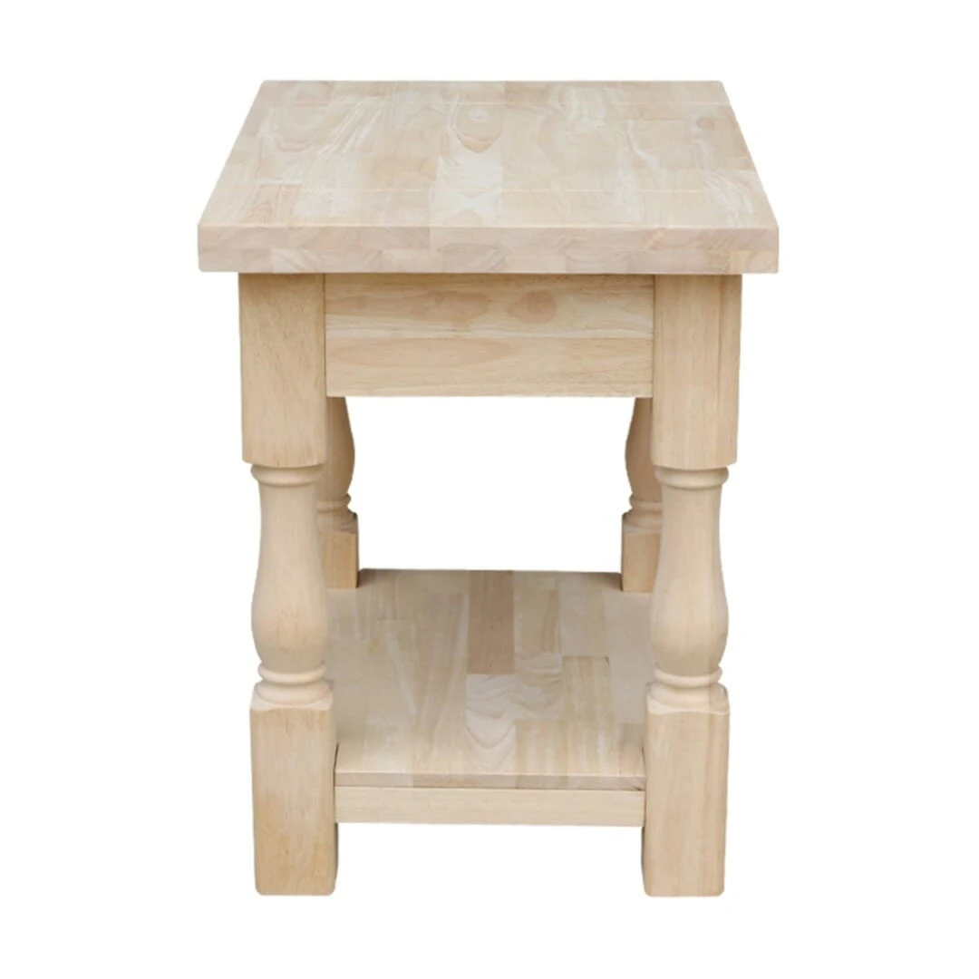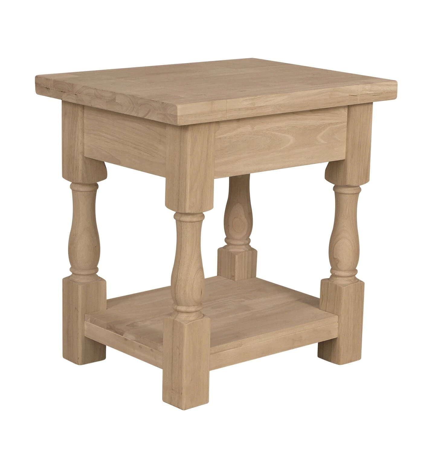 The large, grand Tuscan End Table makes a bold statement in your living room. The thick top adds a sense of scale not found in many other tables. The design and scale of this table offers an eye catching appeal. The lower shelf is the perfect spot for you to place a basket or other large items that need to be easily accessible. Made from solid, eco-friendly Parawood, this table offers maximum strength and durability. The Tuscan end table ships unfinished only, but can be easily stained or painted to match your existing furniture.