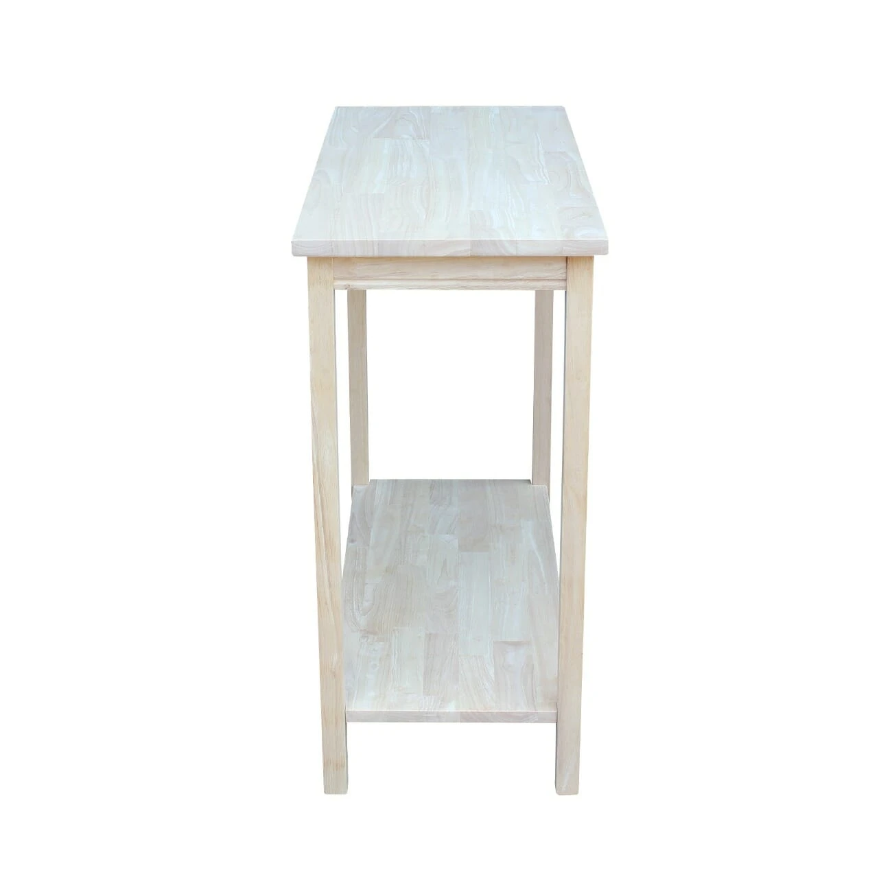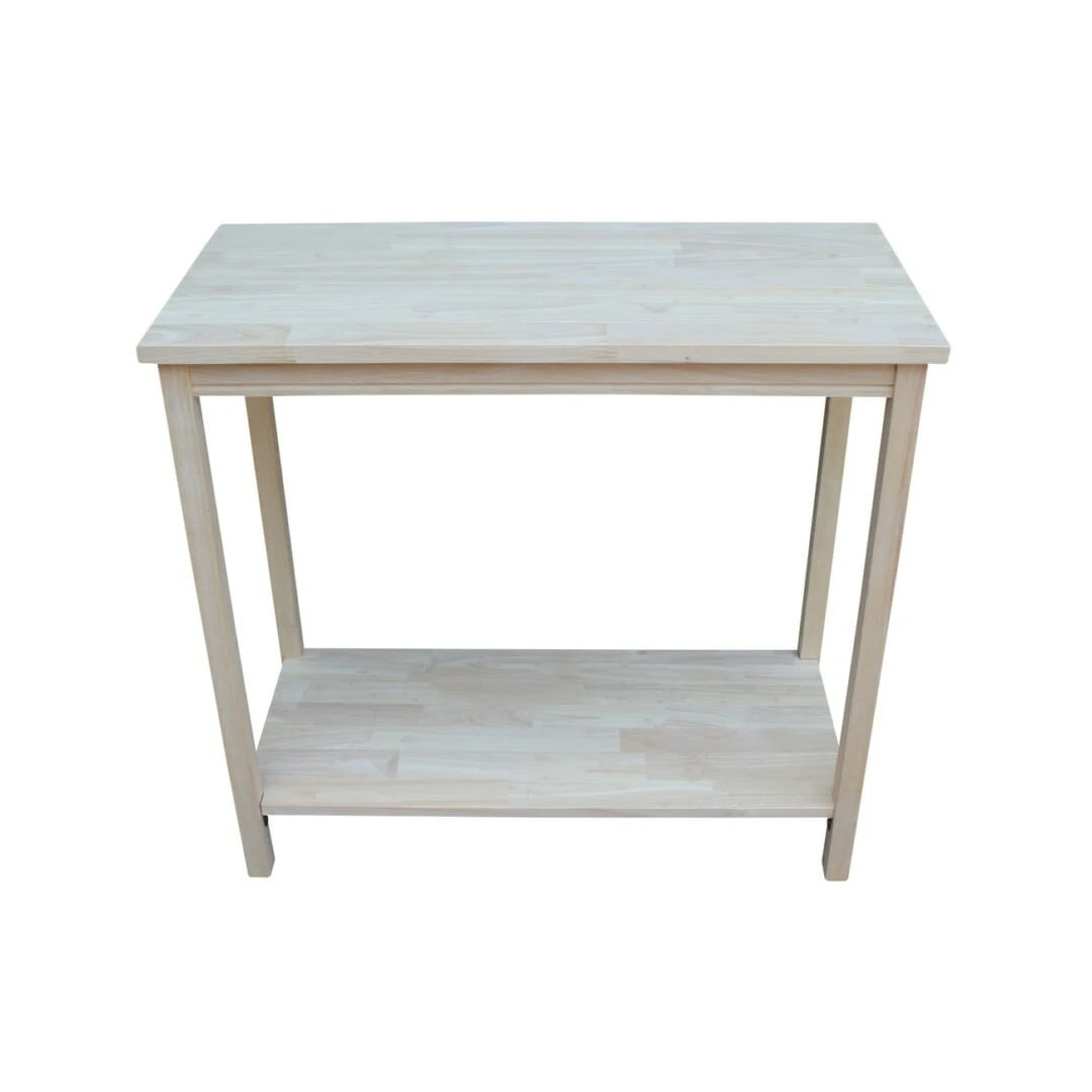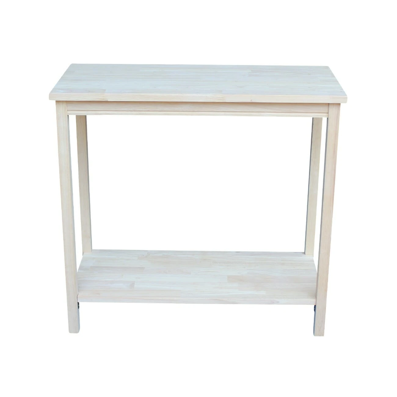 The Portman Console Table features a simple design that gives a modern feel to a traditional Mission style. This sofa table offers a long, solid wood top with a lower shelf for additional storage. It functions as a small TV stand, an entryway table, or as a simple sofa table. The smaller dimensions of this collection are perfect for studio apartment living. Made from solid, eco-friendly Parawood, this table ensures strength and durability. This table ships unfinished, but can also be easily stained or painted to match your existing furniture. This table also pairs well with any of the other pieces in the Portman Occasional Collection and creates a cohesive look. This sofa table ships disassembled with Free Shipping.