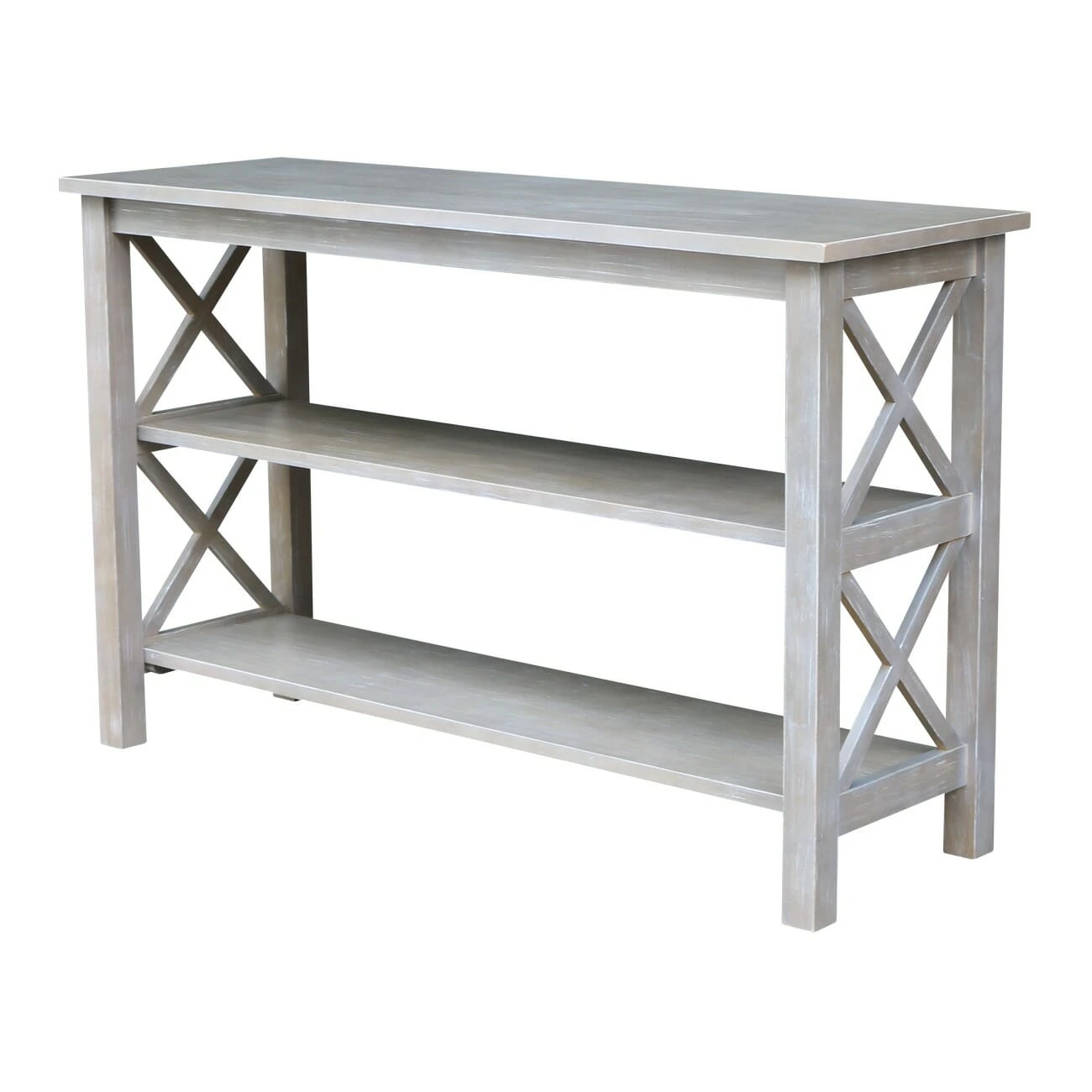The Hampton Sofa Table offers a simple and sturdy design. This table features one removable shelf and one fixed bottom shelf for extra storage. The long, solid wood top will fit up to a 50″ wide television. The X pattern on both sides of the table adds a subtle detail to this otherwise simple table. The Hampton Sofa table is available unfinished or in your choice of 3 factory finishes: Espresso (581), Weathered Gray (09), White (08). It is made from solid, eco-friendly Parawood in order to ensure strength and durability and the unfinished table can also be easily stained or painted to match your existing furniture. To view several finishing tutorials, visit General Finishes‘ website.