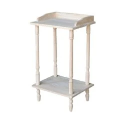 The OT-94 phone stand is a small, occasional table with a traditional, classic design. It features a flat top with a sturdy base that has an eye-catching design. The back and side of the top has an attractive raised edge to keep items from rolling off. The phone stand is small enough to use in a variety of spaces, this table is functional and versatile. Use this end table as a single table between two chairs or as matching end tables bedside your couch. You could also use this table as a plant stand or to display a favorite item. The phone stand is small enough to fit in a variety if different spaces in your home. Made from solid, eco-friendly Parawood, this table offers maximum strength and durability. This end table is available unfinished, but can be easily stained or painted to match your existing furniture.