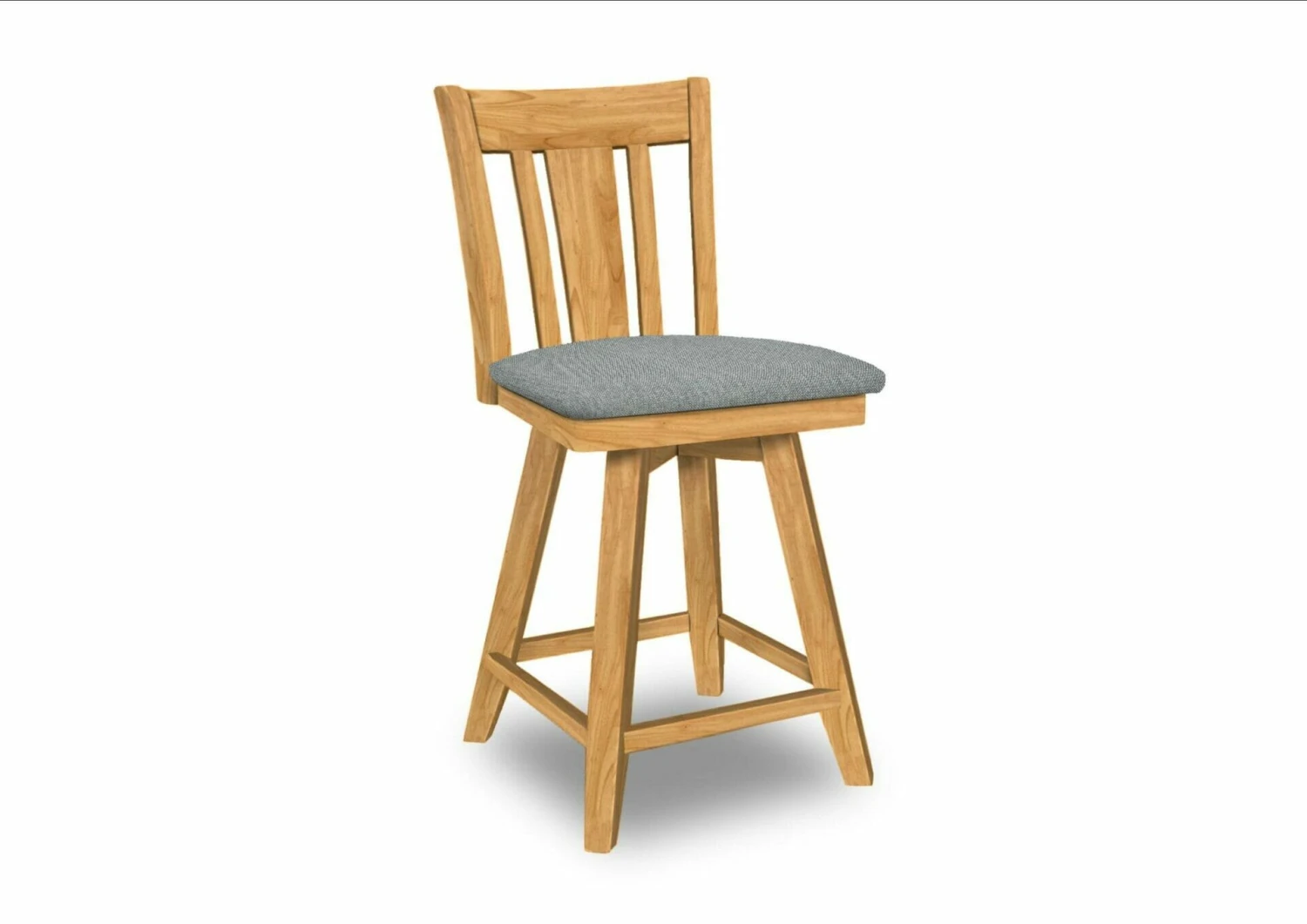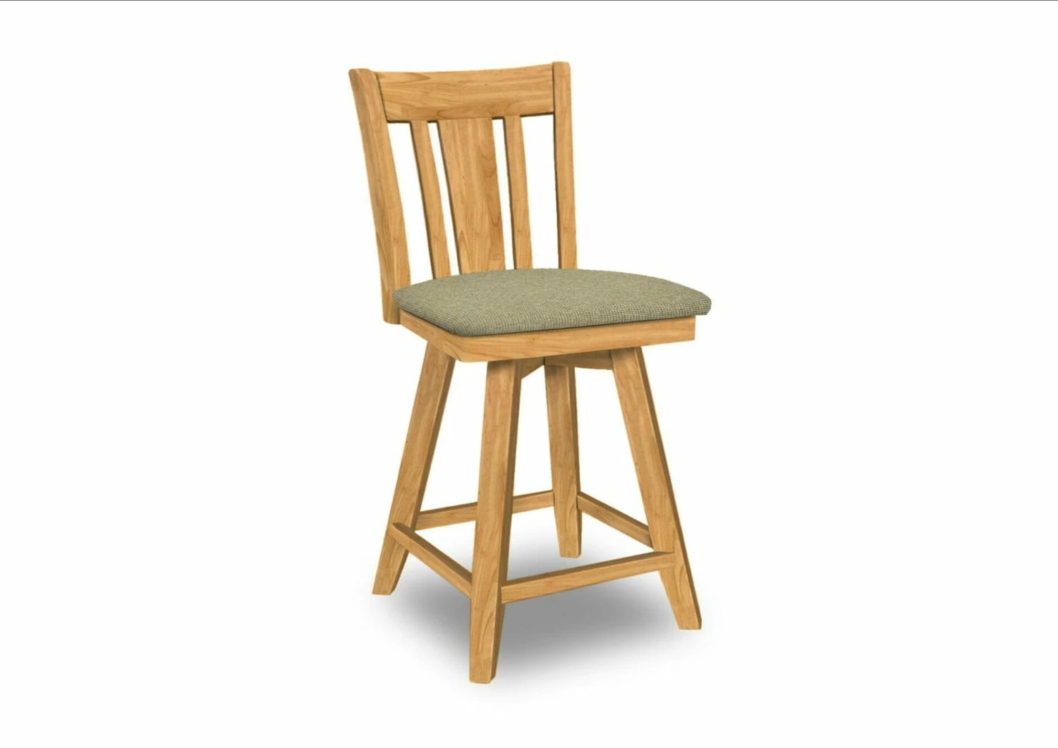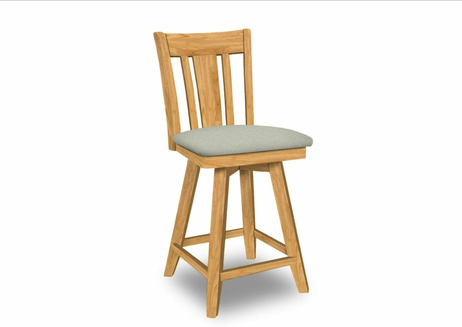 The Upholstered San Remo Swivel Counter Stool has a simple, clean design that pairs well with a variety of styles. This stool features straight, square edge cross members and a wide vertical slat in the middle of the back. With a seat height of 24″, this stool fits perfectly at your 36″ counter or table. In addition, the sturdy ball-bearing swivel seat provides extra functionality when dining with your family or entertaining your friends. It is made from solid, eco-friendly Parawood in order to ensure strength and durability. Furthermore, the stretchers are both screwed and glued in place to protect your stool from strenuous and everyday use. This stool is available unfinished with your choice of several fabric options. The picture gallery allows viewing of several fabrics on the stool. Click here to view additional fabric options: Standard Fabric Options.