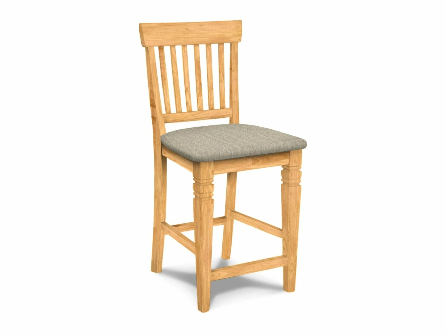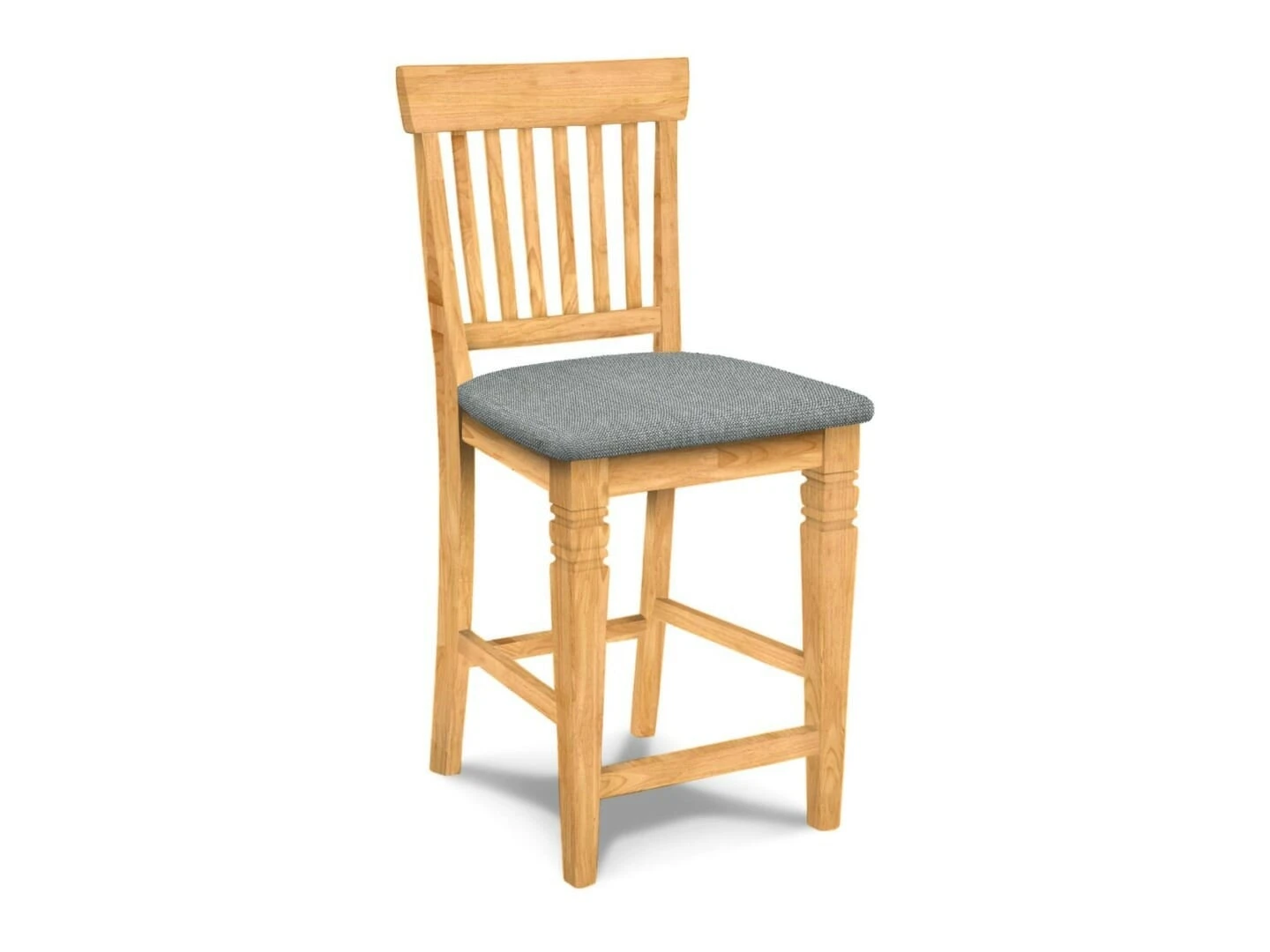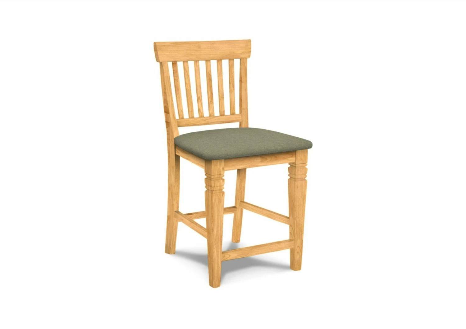 The S-112 Upholstered Seattle Counter Stool offers a classic design that will never go out of style. With a seat height of 24″, this stool fits perfectly at your 36″ counter or table. This stool features a traditional, slat-back design and a detailed cut on the front legs for added flair. Made from solid, eco-friendly Parawood, this stool has strength and durability. Furthermore, the stretchers are both screwed and glued in place to protect your stool from strenuous and everyday use. This counter stool is available unfinished with your choice of several fabric options. The picture gallery allows viewing of several fabrics on the stool. Click here to view additional fabric options: Standard Fabric Options. This stool is also available with a standard wood seat: S-112.