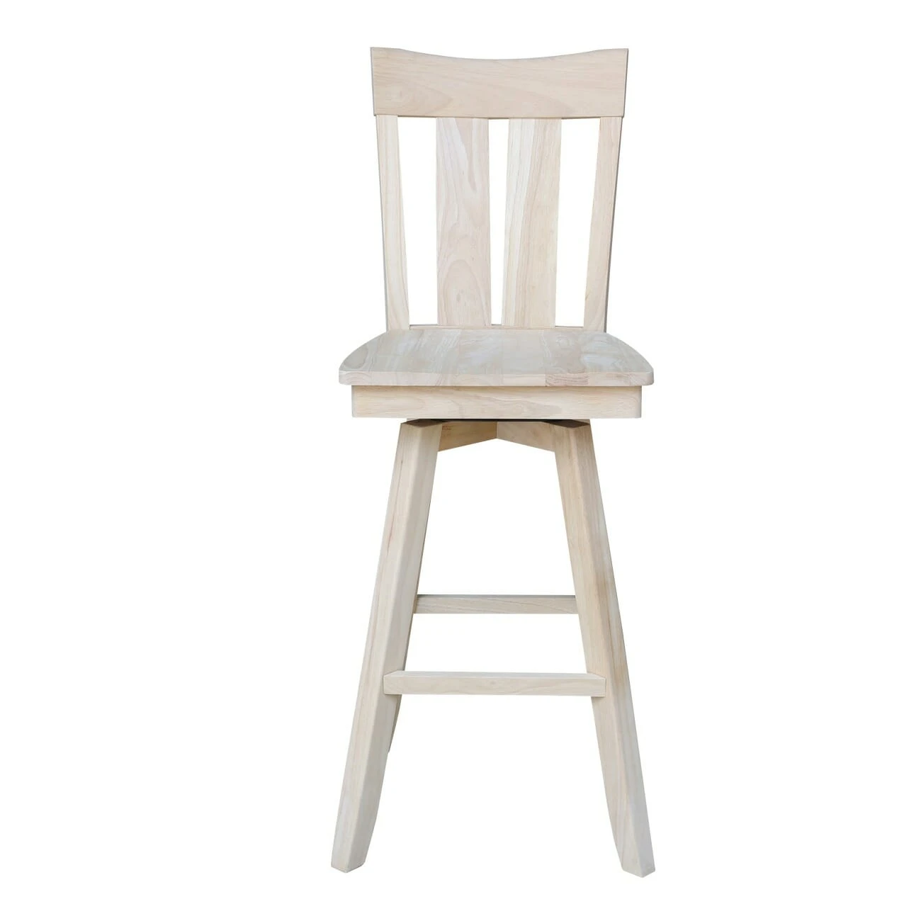 The S-133SW Ava Swivel Bar Stool has a simple, clean design that pairs well with a variety of styles. It features two wide, vertical slats on the back with a gentle curve at the top. The curved back provides excellent lumbar support, without compromising style. This stool features a heavy duty metal ball bearing swivel with a full 360 degree of motion. With a seat height of 30″, this stool is designed to be used at your 42″ tall bar or table. It is made from solid, eco-friendly Parawood in order to ensure strength and durability. Furthermore, the stretchers are both screwed and glued in place to protect your stool from strenuous and everyday use. The Ava Swivel Bar stool is available unfinished, but can be easily stained or painted to match your existing furniture. This stool is also available with a non-swivel seat: Ava Bar Stool.