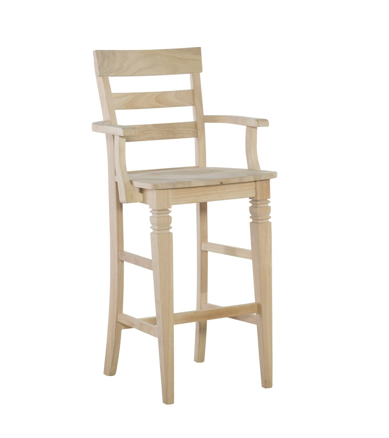 The S-193AB Java Bar Stool with Arms has a classic ladder style back that will hold you in full comfort. It features a gentle curve to the back and a delicately detailed cut on the front legs giving this stool an old world elegance. The stool sits 30″ tall and is designed for your 42″ tall bar table. In addition, it is made from solid, eco-friendly Parawood in order to ensure strength and durability. The stretchers are both screwed and glued in place to protect your stool from strenuous and everyday use. The Java Bar Stool is available unfinished, but can be easily stained or painted to match your existing furniture. This stool is also available without arms: Java Bar Stool.
