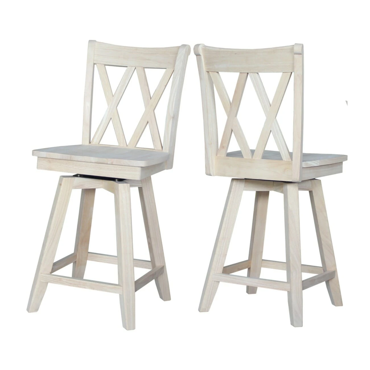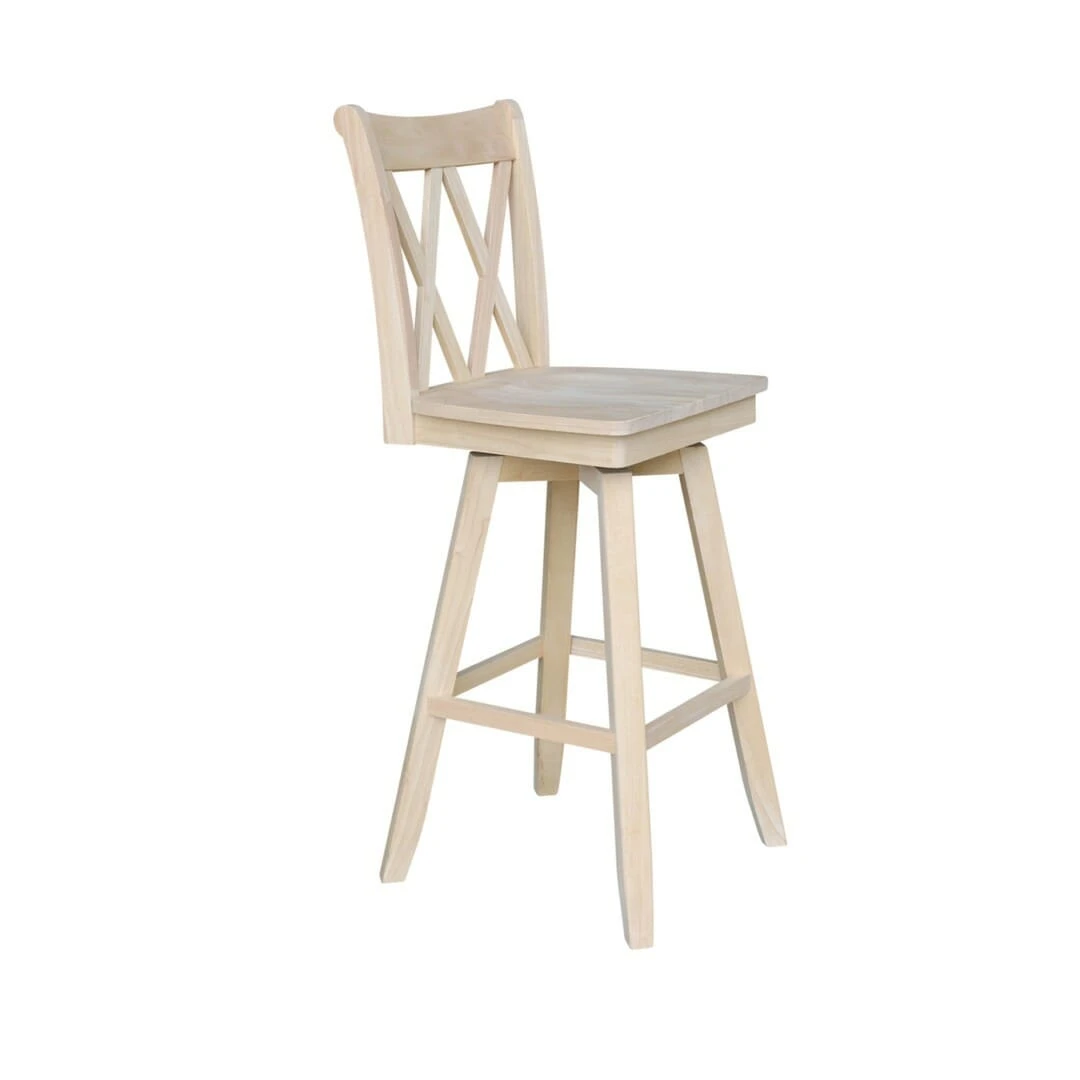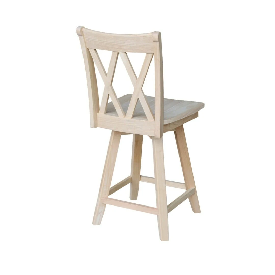 One of our most popular models, the XX Swivel Counter Stool offers a simple, contemporary design. It features a double X Avignon style back and a subtle French-inspired curve on the front legs. Sitting at 24″ tall, this stool has a heavy duty ball bearing swivel with a full 360 degree rotation and is perfect for a 36 inch tall table or bar. Made from solid, eco-friendly Parawood, this stool is both strong and durable. Furthermore, the stretchers are both screwed and glued in place to protect your stool from strenuous and everyday use. This stool is available unfinished, but can be easily stained or painted to match your existing furniture. This stool is also available with arms S-202SWAB or with an upholstered seat S-202SW-F6.