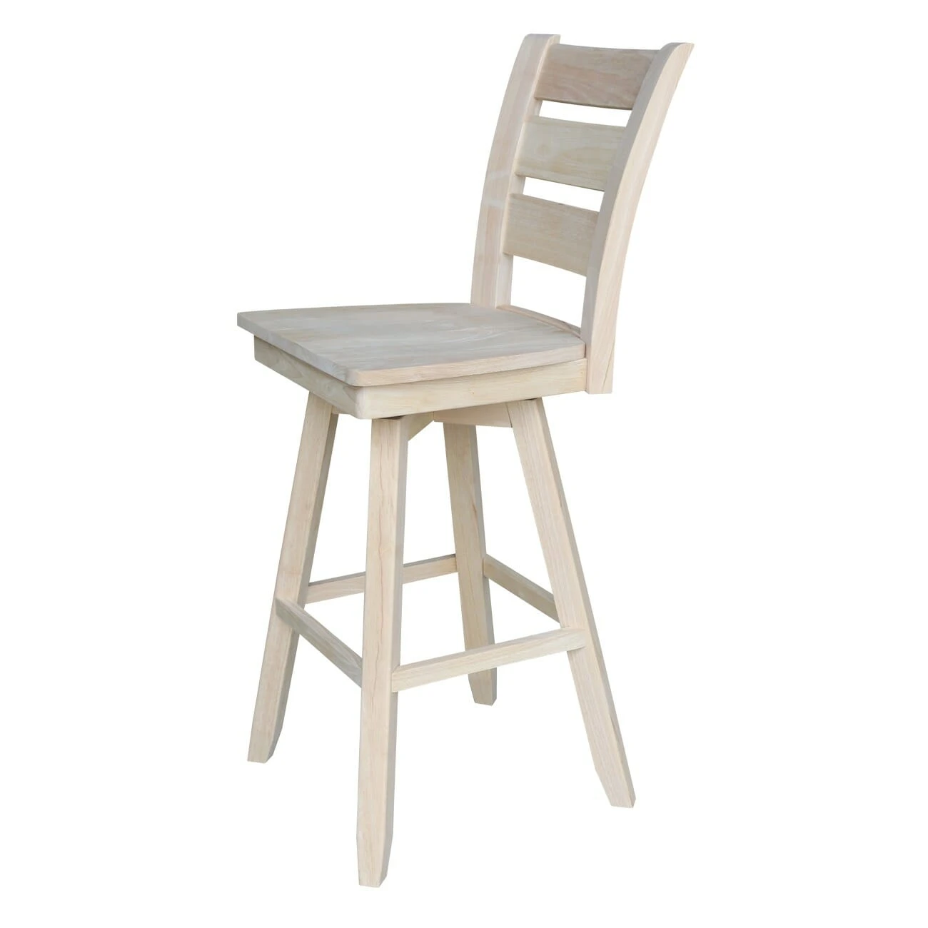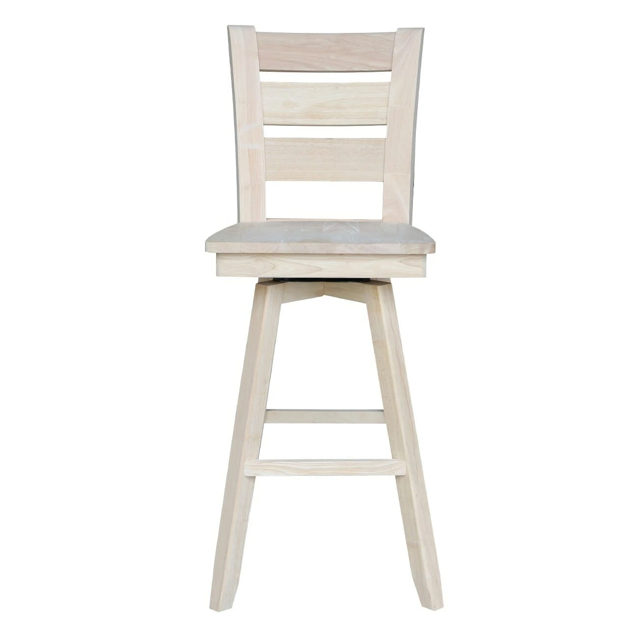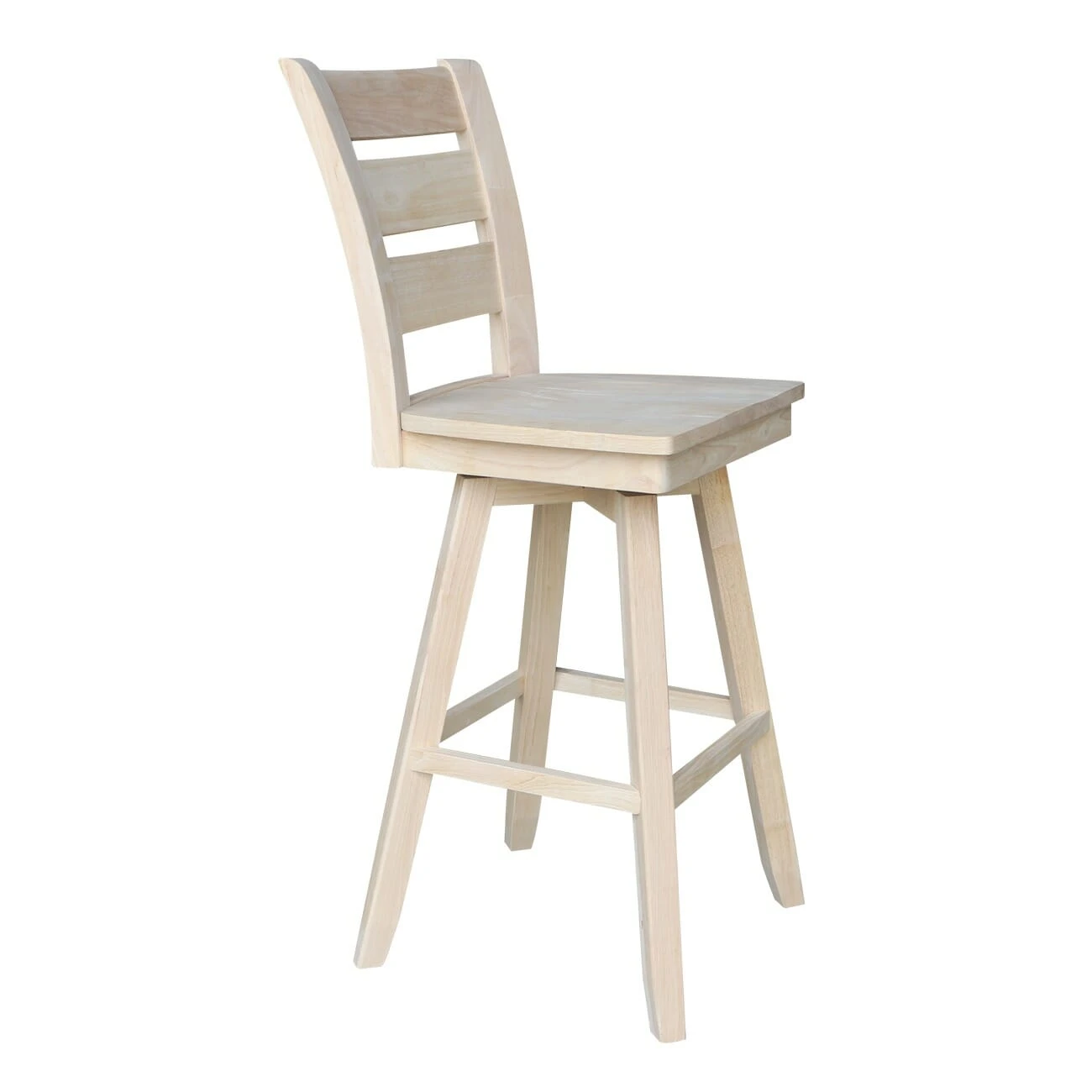 The S-293SW Tuscany Swivel Bar Stool has simple, clean lines combined with a sturdy feel. The wide slats across the back of the stool offer excellent lumbar support and are balanced by the subtle taper of the legs. Sitting at 30″ tall with a full 360 degree swivel, this stool is perfect for a 42 inch tall table or bar. This stool is made from solid, eco-friendly Parawood in order to ensure strength and durability. Furthermore, the stretchers are both screwed and glued in place to protect your stool from strenuous and everyday use. This stool is available unfinished, but easily stains or paints to match your existing furniture. This bar stool pairs well with the Tuscany Chair.