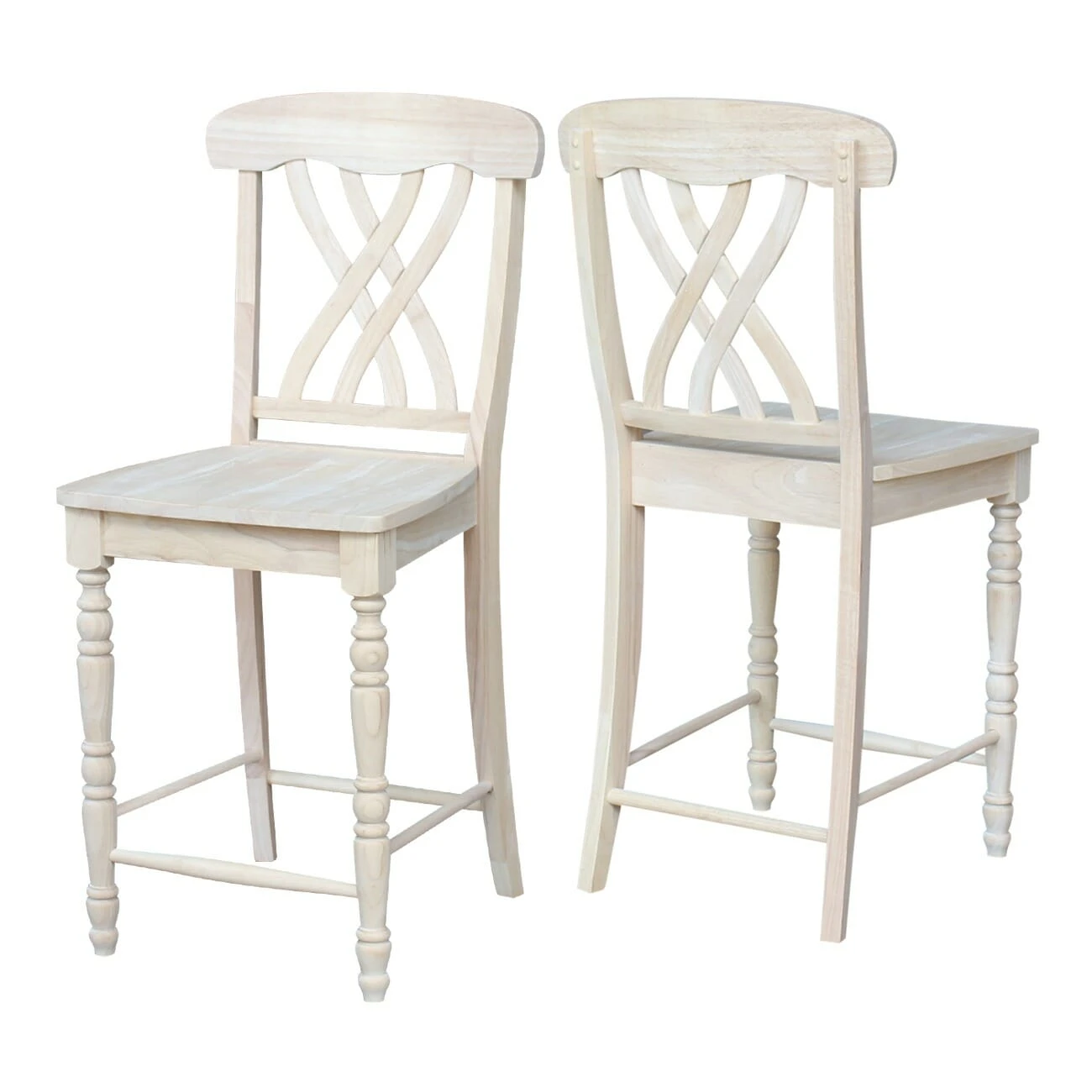 The S-3902 Lattice Back Counter Stool features delicately curved lines and intricate detailing on the legs. It brings a beautiful, formal element to any style. The seat height is 24 inches tall and is designed to pair with a 36 inch tall table or counter bar. It is made from solid, eco-friendly Parawood in order to ensure maximum strength and durability. Furthermore, the leg stretchers are both screwed and glued in place to protect your stool from strenuous and everyday use. The Lattice Back counter stool is available unfinished, but can be easily stained or painted to compliment your existing furniture. It pairs well with the C-390 Lattice Back Chair.