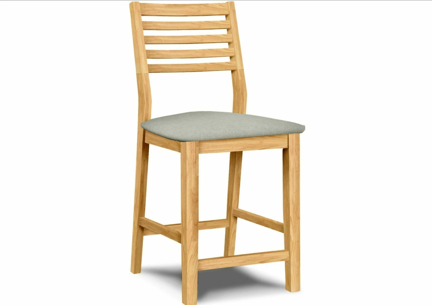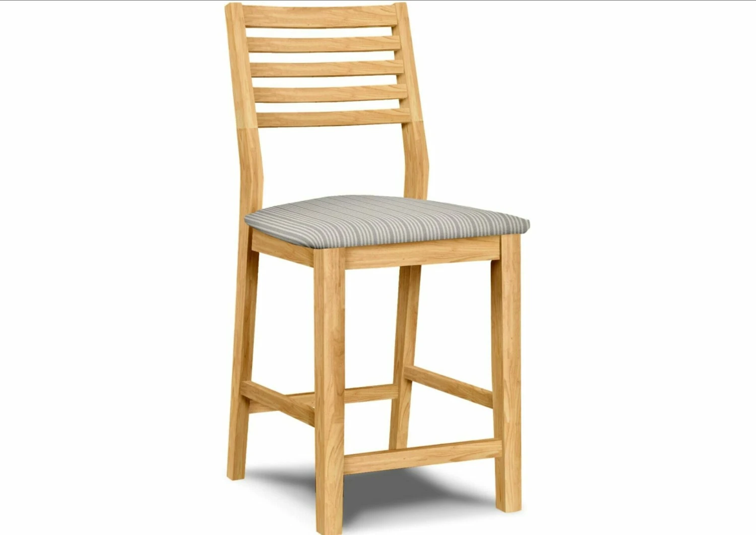 The Upholstered Aspen Ladder Back Counter Stool shares the same frame as the S-32 Aspen Panel Back Counter Stool but features slats instead of a back panel. It offers a simple style and is designed to pair with a 36-inch tall counter or table. The wide back gives this stool a modern feel and also provides excellent lumbar support. It is made from solid, eco-friendly Parawood in order to ensure strength and durability. Furthermore, the stretchers are both screwed and glued in place to protect your stool from strenuous and everyday use. This stool is available unfinished with your choice of several fabric options. The picture gallery allows viewing of several fabrics on the stool. Click here to view additional fabric options: Standard Fabric Options. This stool is also available with a standard wood seat: S-42.