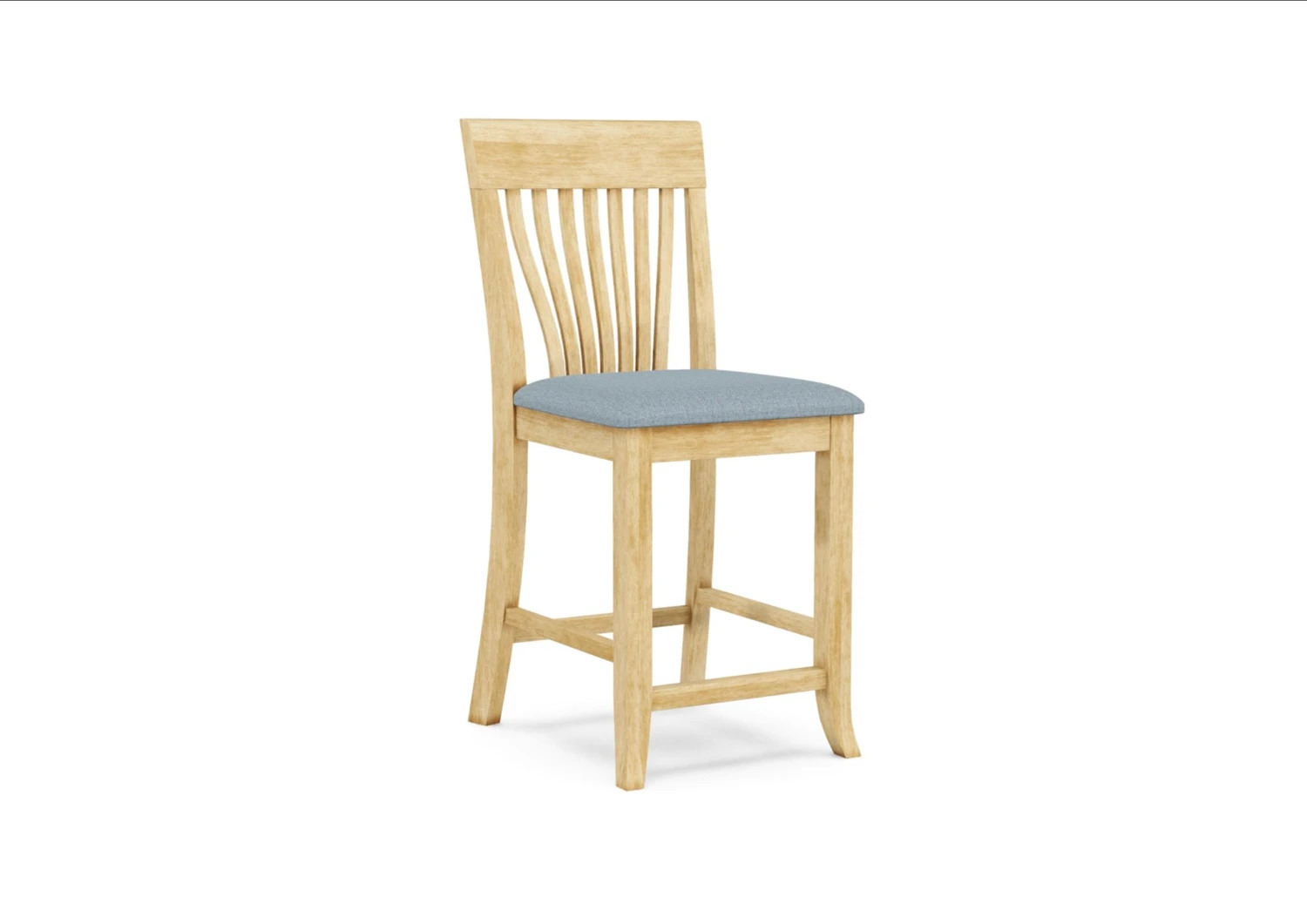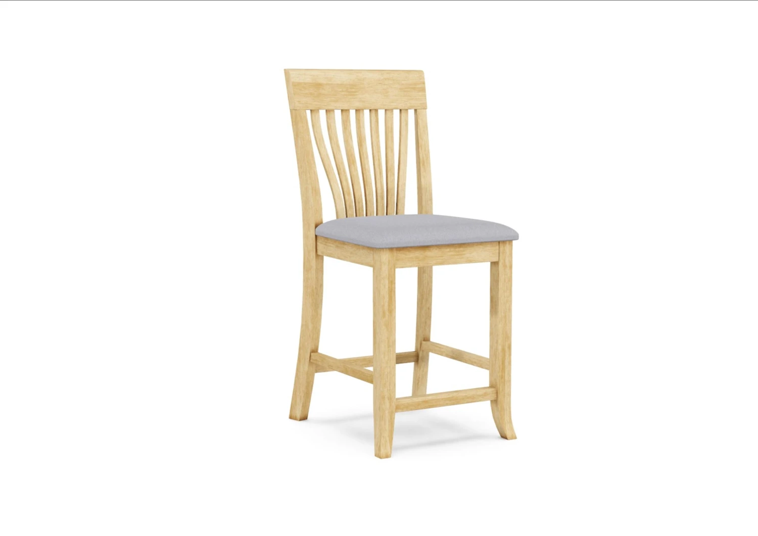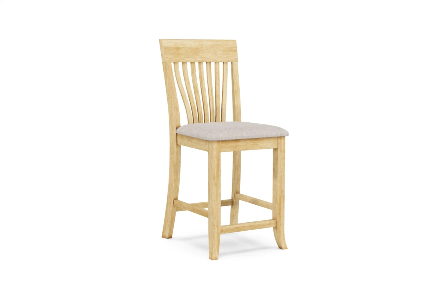 The Upholstered Amanda Counter Stool features traditional vertical slats with the addition of a graduated curve towards the seat. This sunburst spindle design adds an eye-catching detail and also provides excellent lumbar support. It is designed to be used at a standard kitchen counter height of 36 inches tall. This stool is made from solid, eco-friendly Parawood in order to ensure strength and durability. Furthermore, the stretchers are both screwed and glued in place to protect your stool from strenuous and everyday use. This stool sells unfinished with your choice of several fabric options. The picture gallery allows viewing of several fabrics on the stool. Click here to view additional fabric options: Standard Fabric Options. It matches the Amanda Chair, Amanda Arm Chair, and the Curated Amanda Chair and is also available with a standard wood seat ( S-582).