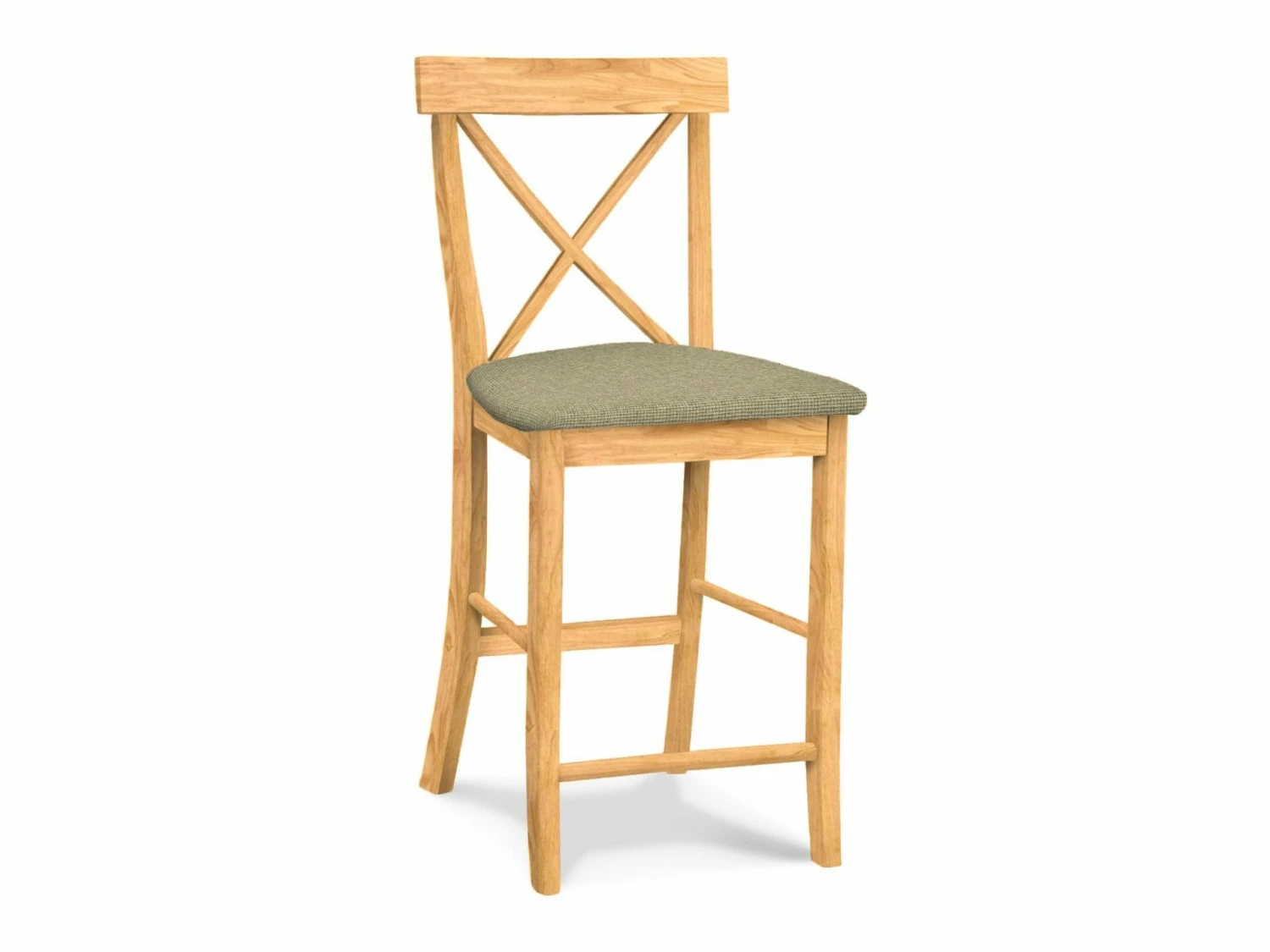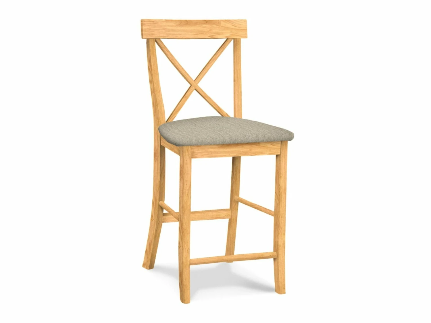 The Upholstered X Back Counter Stool has a simple, yet elegant X pattern giving this chair a delicate feel. The front legs of the stool have a slight forward angle at the bottom. The 24″ seat height allows this stool to pair well with any 36″ counter or bar table. Made from solid, eco-friendly Parawood, this stool has strength and durability. Furthermore, the stretchers are both screwed and glued in place to protect your stool from strenuous and everyday use. This counter stool is available unfinished with your choice of several fabric options. The picture gallery allows viewing of several fabrics on the stool. Click here to view additional fabric options: Standard Fabric Options. This stool is also available with a standard wood seat: S-6132.