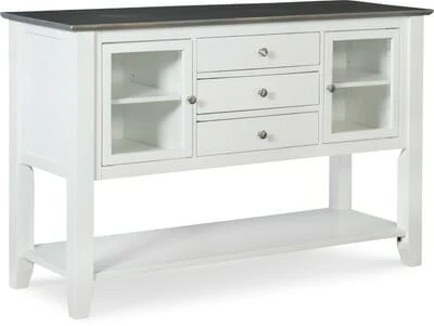 The Cosmopolitan Server offers a traditional design with clean and simple lines. With three drawers and two glass doors, this server offers both concealed storage and open display. The drawers and doors are inset within the face frame of the unit. In addition, the drawers slide on Euro glides for easy opening and closing. There is also a removable shelf behind each of the glass doors. The thick top provides ample room for dishes, serving pieces, photos, collectibles, or anything you wish to display. Made from solid, eco-friendly Parawood, this server offers excellent strength and durability. It ships unfinished but easily stains or paints in order to match your existing furniture or add a pop of color to your space. Use this piece as a traditional server or as a unique entryway storage table in a large foyer.