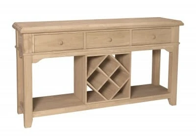 The Canyon Server offers sturdy construction with clean, simple lines. It pairs well with pieces in the Canyon Collection. but is versatile enough to use with almost any other style. The three drawers ride on full extension drawer glides for easy movement. In addition, the drawers are inset within the face frame of the unit. Subtle curved details provide an elegant feel. The solid wood top offers ample space for photos, collectibles, or other items you wish to display. In addition, the center wine rack is removable and can be used anywhere in your home. Made from solid, eco-friendly Parawood, this server offers excellent strength and durability. It ships unfinished but easily stains or paints in order to match your existing furniture or add a pop of color to your space.