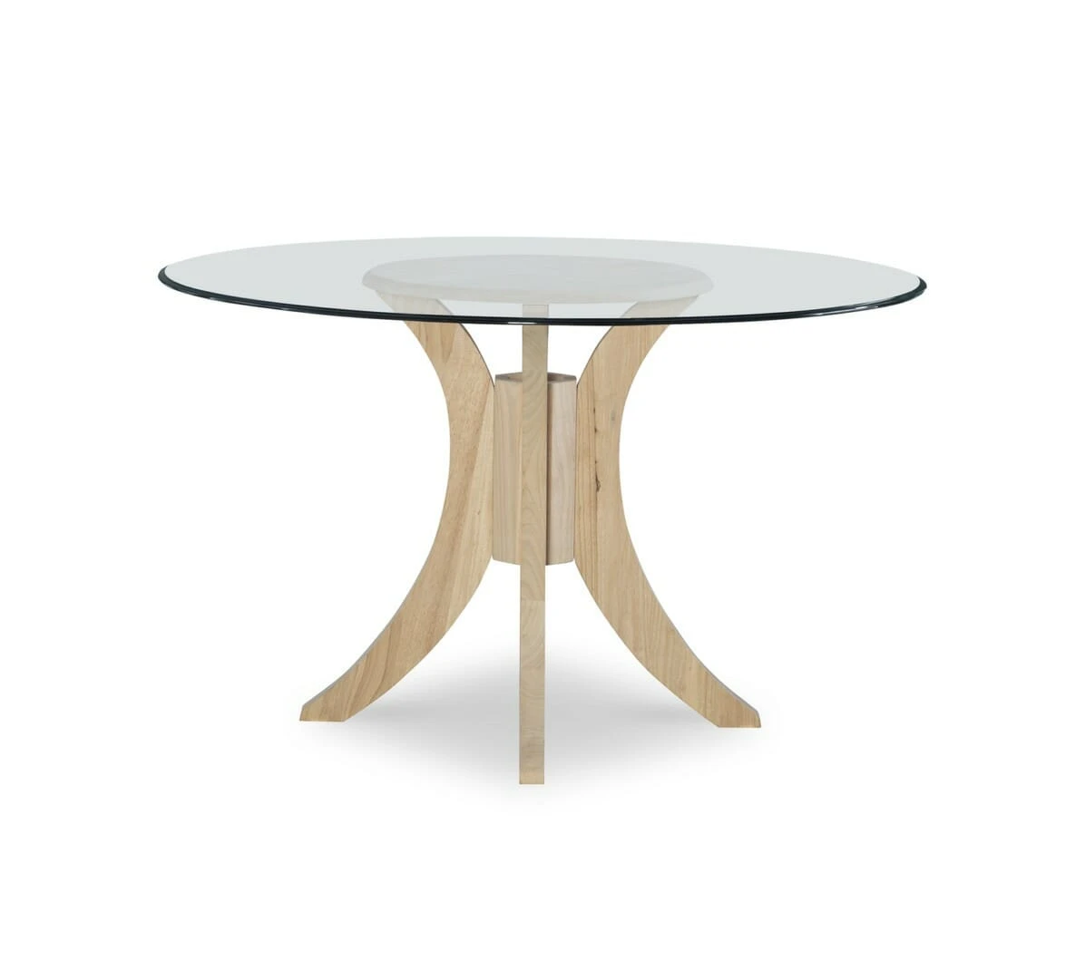 The Sienna Glass Top Table offers timeless elegance with a modern flair. The chic design of the base differs from traditional pedestal bases and adds style and interest to your space. At 48 inches in diameter, this table comfortably seats up to 4 adults. The glass top allows light to shine through, making your dining area feel larger. Made from solid, eco-friendly Parawood, the base offers excellent strength and durability. The base measures 30 inches tall with a 19 inch leg spread. The base ships unfinished, but can be easily stained or painted to compliment your existing furniture or add a pop of color to your space. This glass top table offers the perfect option for your breakfast nook or other small dining space.