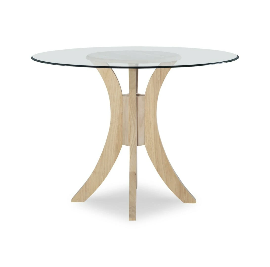 The Sienna Glass Top Table offers timeless elegance with a modern flair. The chic design of the base differs from traditional pedestal bases and adds style and interest to your space. At 36 inches tall, this table will go with any standard counter-height stools and can comfortably seat 4 adults. The glass top allows light to shine through, making your dining area feel larger. Made from solid, eco-friendly Parawood, the base offers excellent strength and durability. The base measures 36 inches tall with a 29-1/4 inch leg spread. The base is unfinished, but can be easily stained or painted to compliment your existing furniture.
