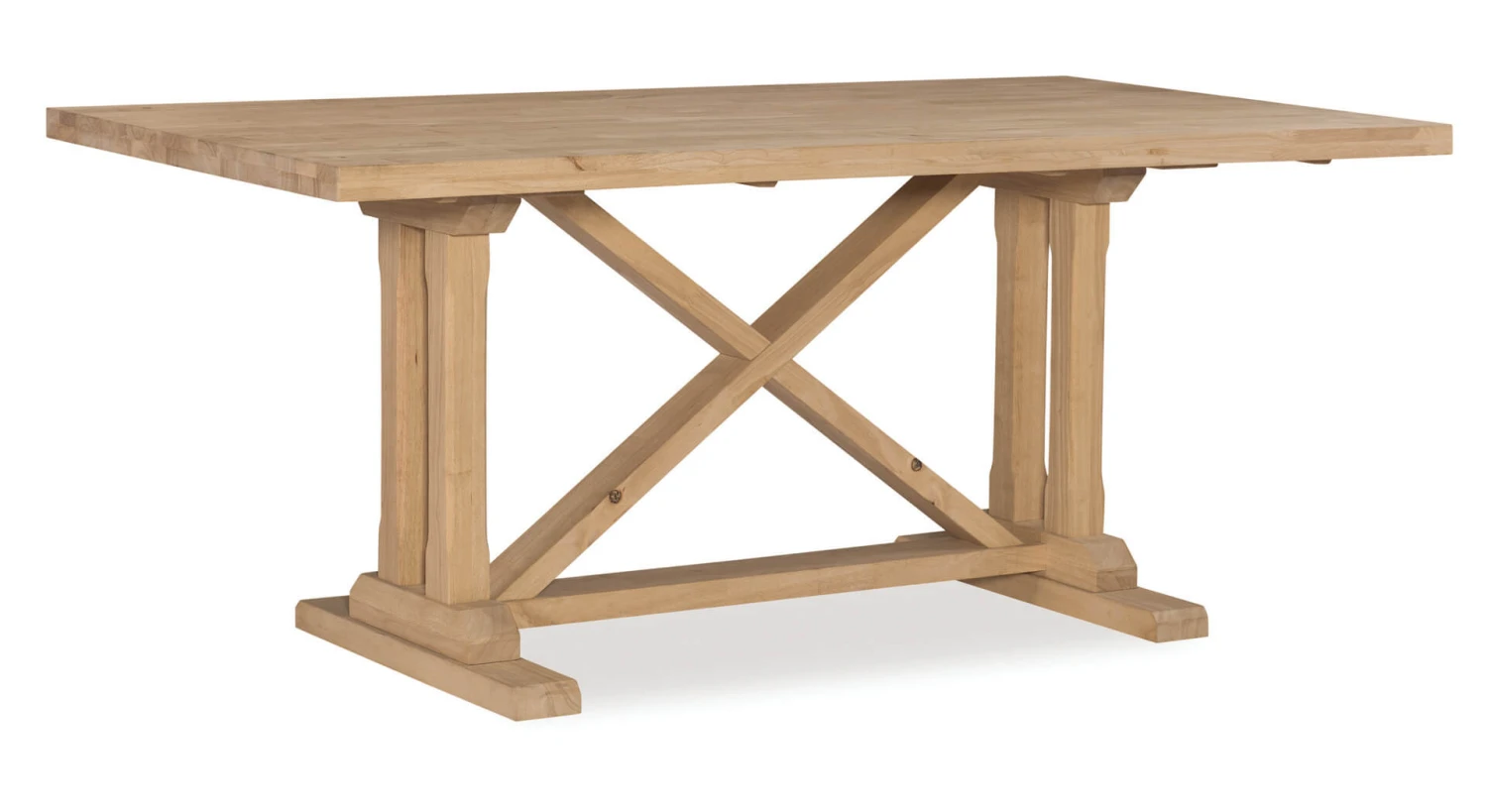 The Alexa Trestle Table works perfectly in a large kitchen or dining space. The solid wood, straight edge top provides ample space for seating with a unique base that is sure to catch the eye. The tall pedestals are spaced 44 1/4″ apart and connect with a simple X pattern design. Made from solid, eco-friendly Parawood, this table ships unfinished. It easily stains or paints to match your existing furniture or add a pop of color to your space. The Alexa Trestle Table pairs perfectly with the Alexa Trestle Bench (sold separately), but also works well with any of our dining chairs. This sturdy table has a simple design that will compliment any kitchen, dining room, or entertainment space.