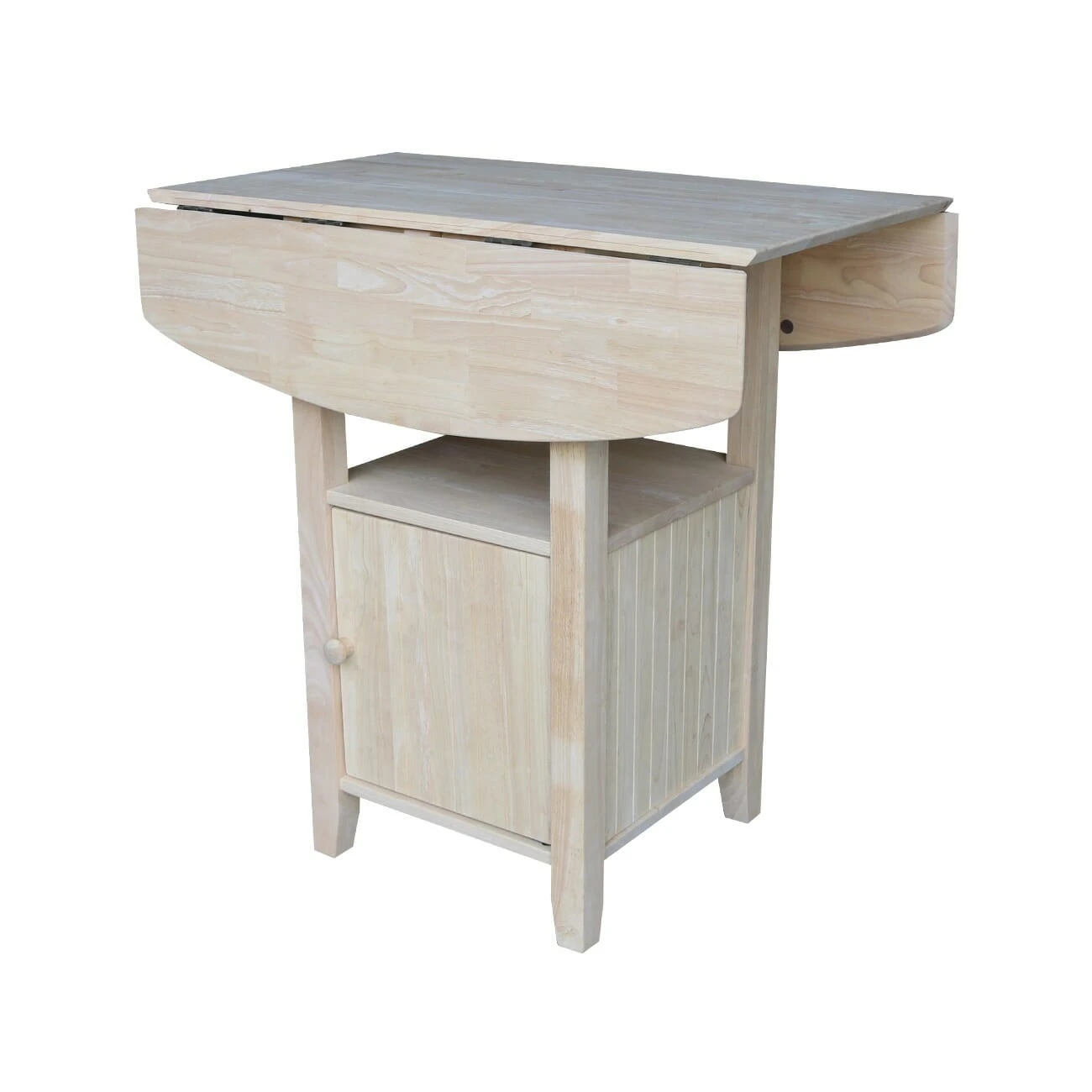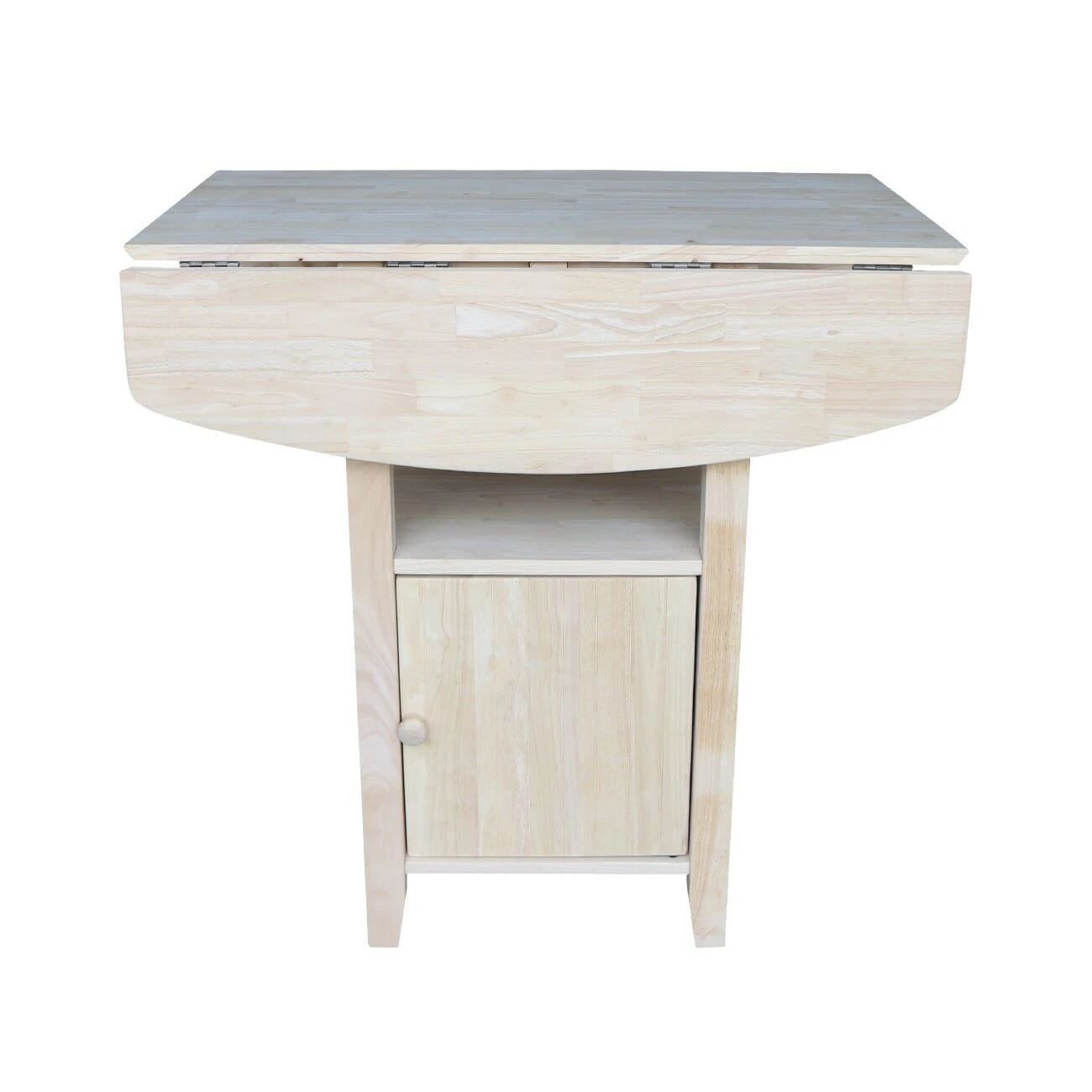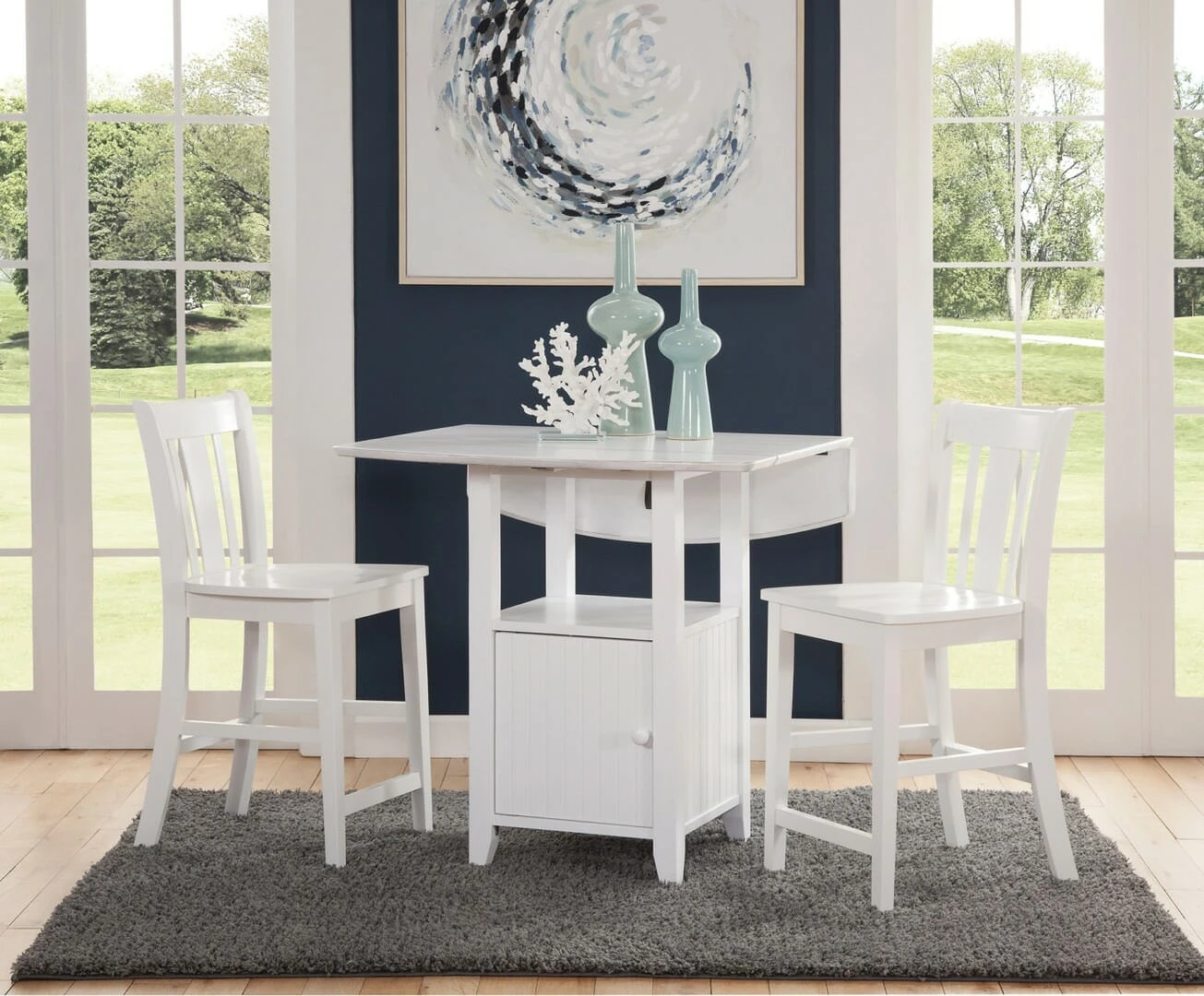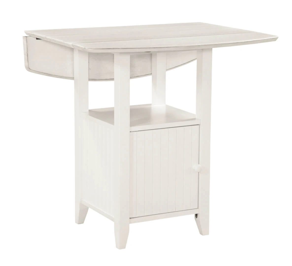 The Dropleaf Bistro Table is a unique table that works well in a smaller kitchen or dining space. This table features two 9-inch dropleaves that can be raised to create a table for four. It also offers concealed storage in the base of the piece. This table stands at counter height; It is 36 inches wide and 20 inches deep with both leaves down and extends to 38″ inches deep with both leaves up. Made from solid, eco-friendly Parawood for strength and durability, the Bistro Table ships unfinished or in a factory finish of Chalk and White. The factory finish matches the rest of the Hampton Dining Collection with the top of the table finished in Chalk and the base and skirt in White. This table would be perfect for an apartment or loft.