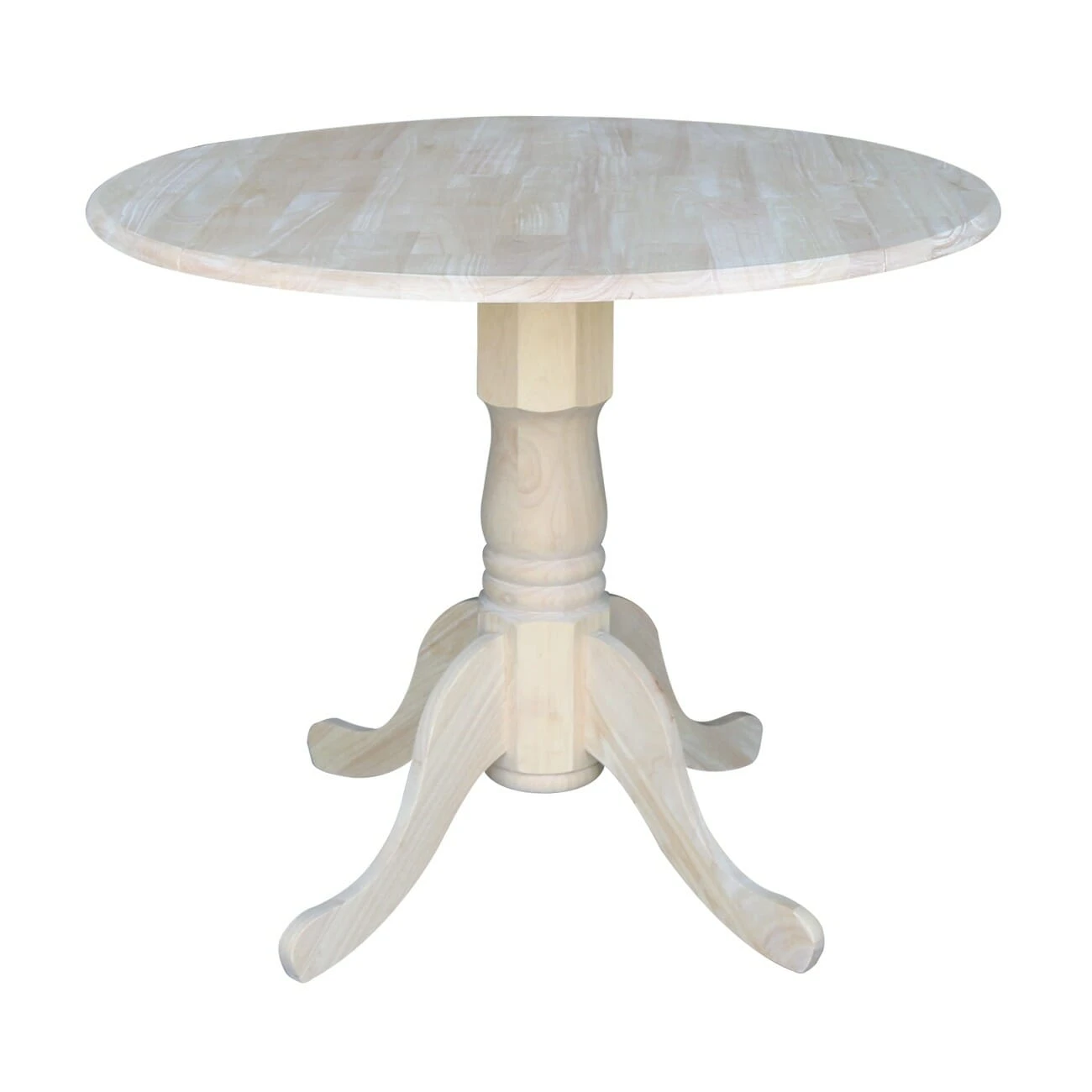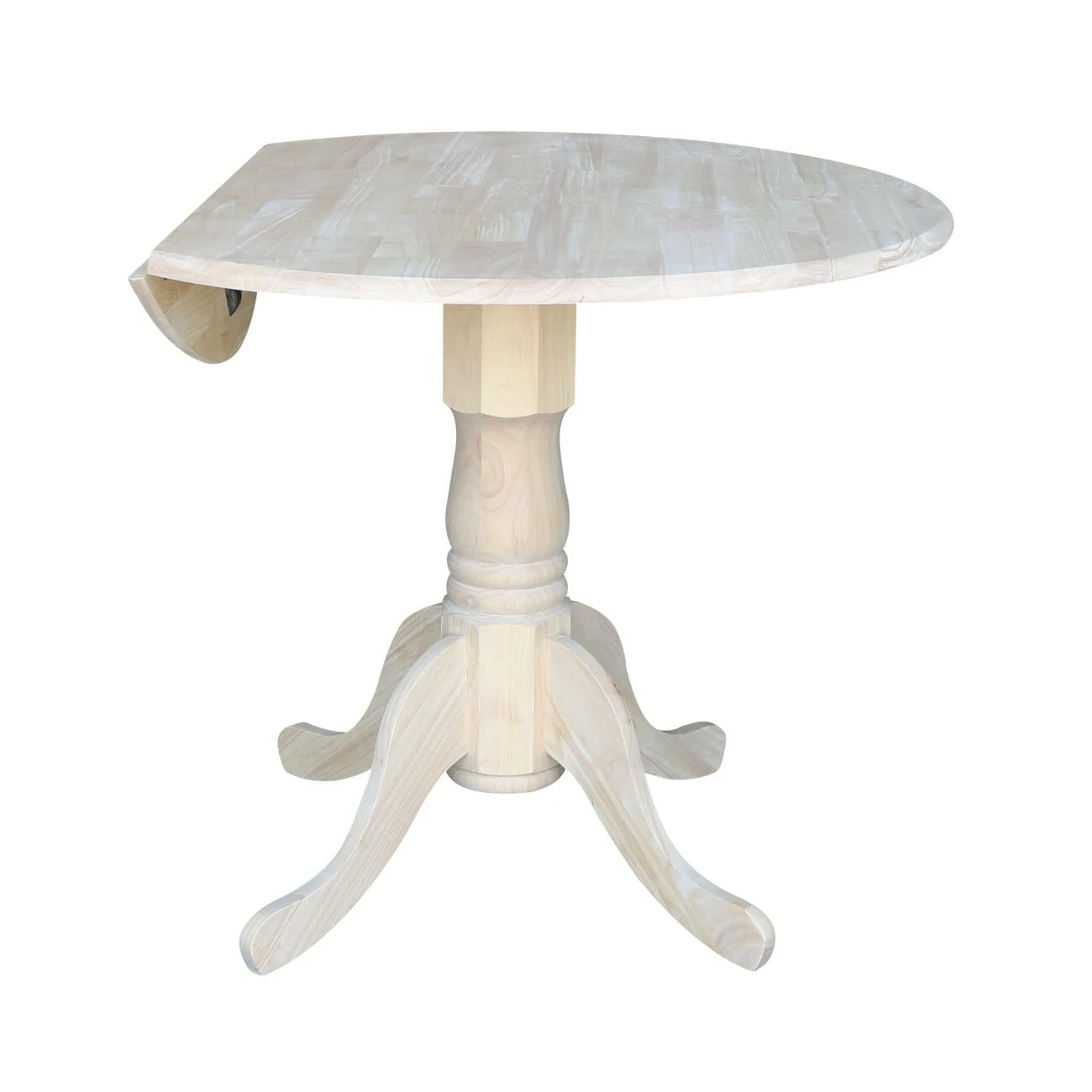 The Round Drop Leaf Table features a solid wood top with subtle curves on the base. This simple table works well in a smaller kitchen and fits perfectly in an apartment or loft. It features two 6″ leaves that drop on either side. Drop both leaves to create a 24 X 36 inch table that can be easily placed against a wall when not in use. Made from solid, eco-friendly Parawood for strength and durability, the round dropleaf table ships unfinished. It also easily stains or paints to match your existing furniture or to add a pop of color to your space. Pair this traditional table with any of our dining chairs in order to create a complete set.