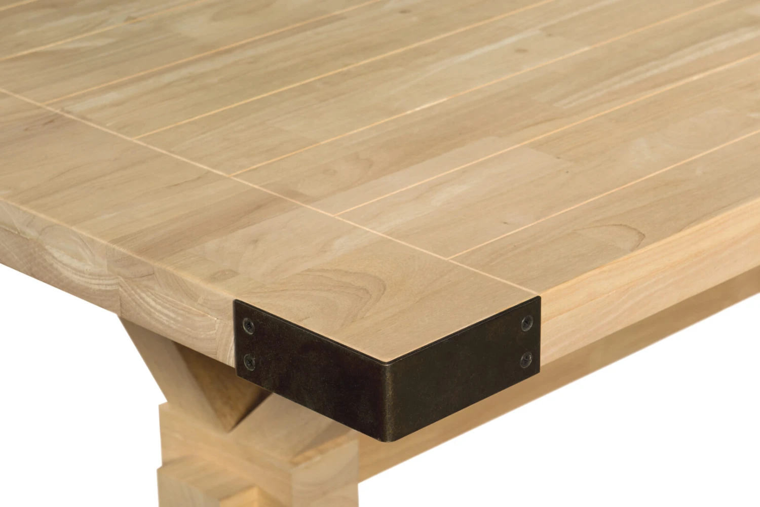 The Farmhouse Chic Table works perfectly in a large kitchen or dining space. It features a solid wood, 3/4″ top with an additional 3/4″ banding that runs along the bottom edge of the table. The top also features a pseudo beadboard edge and decorative metal corners that easily remove for finishing. The X-style base adds visual interest and provides extra stability for this large piece. Made from solid, eco-friendly Parawood, this table offers excellent strength and durability. The Farmhouse Chic Table ships unfinished but easily stains or paints to match your existing furniture or add a pop of color to your space. Pair this table with any of our dining chairs in order to create a complete set.