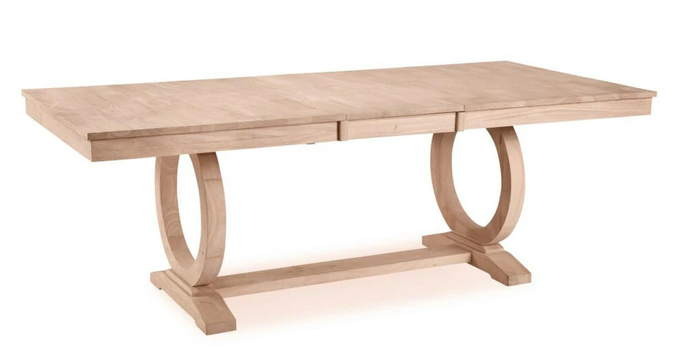 The Ring Trestle Table has a square edge top and a stately circular base. This table makes a grand statement in your dining room. It includes a self storing leaf that allows you to extend the table from 66″ to 86″ in length. Seat up to 8 adults comfortably when the leaf is extended. Made from solid, eco-friendly Parawood for strength and durability, the Ring Trestle table ships unfinished. Pair it with any of our dining chairs in order to create a complete set. This table also easily stains or paints to match your existing furniture or to add a pop of color to your space. This trestle table works well in a large kitchen or dining space.