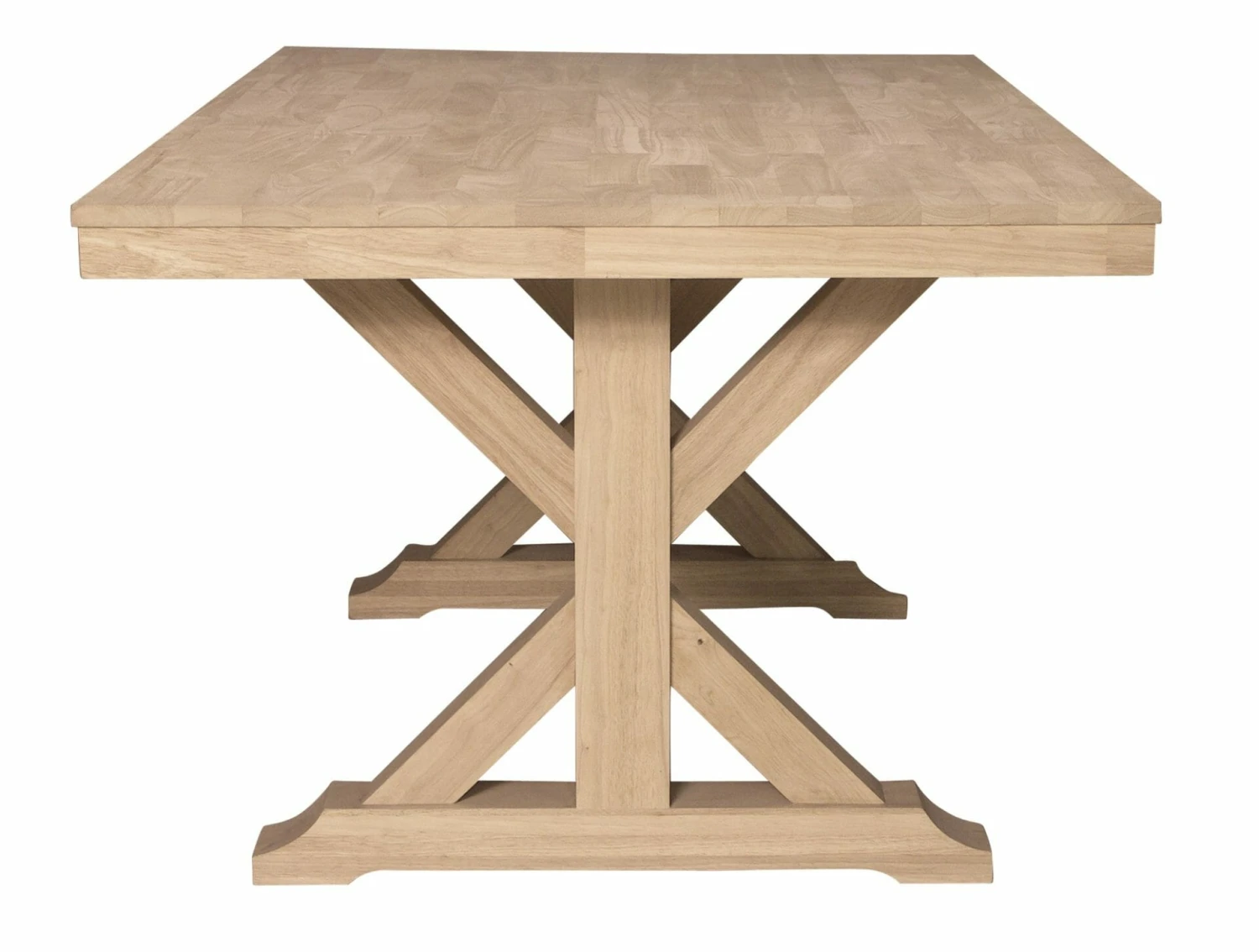 The Canyon Solid Top Trestle Table and Base features a straight edge top with a sturdy X-patterned base. It offers ample seating for up to 6 adults and is perfect for entertaining. The simple lines allow you to pair this table with almost any home decor. Made from solid, eco-friendly Parawood for strength and durability, the Canyon Trestle Table ships unfinished. It also easily stains or paints to match your existing furniture or to add a pop of color to your space. This Canyon Solid Top Trestle Table and Base looks great with any of the pieces in the Canyon Collection and creates a cohesive look.