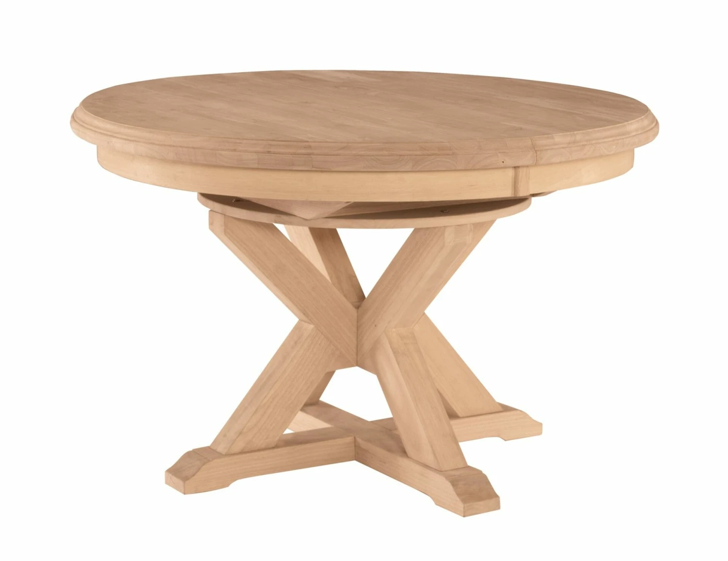 The T-4184XBT Canyon Extension Pedestal Table is part of the Canyon Collection. This large, round table works perfectly in a large kitchen or small dining room. It includes a self-storing butterfly leaf. This table ships unfinished, but easily stains or paints to match your existing furniture. Enjoy the fine craftsmanship of John Thomas with a table that is beautifully made, long-lasting, and affordable.