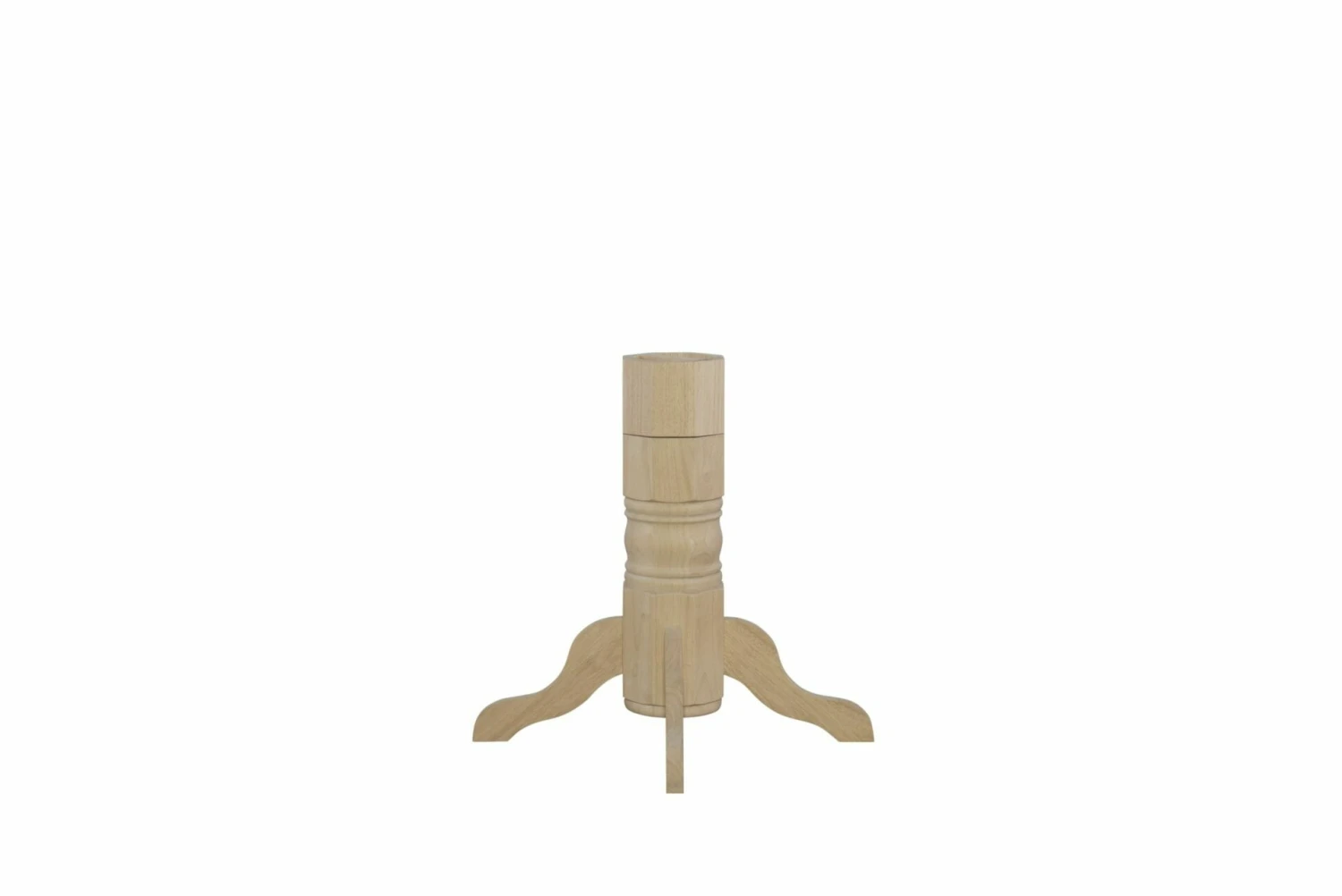 This base features a large round pedestal with gently curved feet. When combined with a table top, this base creates a 36 inch tall counter height table. The base is an 8-1/4 inch pedestal and features four threaded inserts on top. In addition, the spread on the legs is 33-1/4 across. A wood plate and uprights will also need to be fabricated to attach our pedestal to your existing table top. This base is made from solid, eco-friendly Parawood in order to ensure strength and durability. It ships unfinished, but can be easily stained or painted to match your existing furniture.