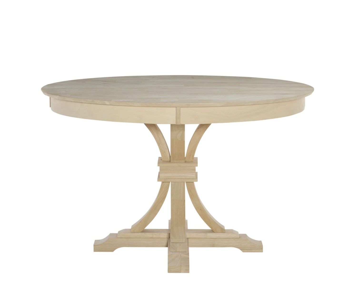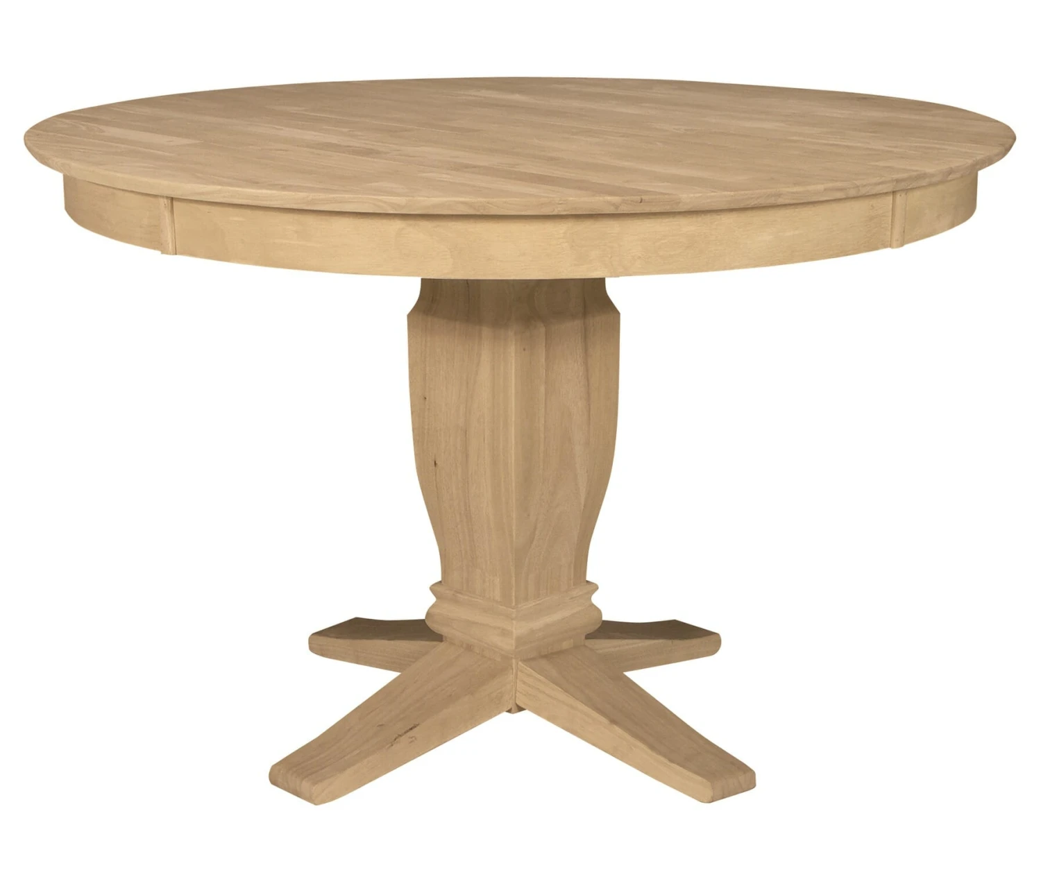 This Round Table features a reverse bevel edge which is 3/4″ thick. It pairs with your choice of bases to create your own design. Choose a standard height base to make this table 30″ tall for use with your 18 inch tall dining chairs. Choose a gathering height pedestal to make it counter height at 36″ tall to pair with your 24 inch tall counter stools. You can also purchase the top individually and pair it with your own base. Made from solid, eco-friendly Parawood, this table ships unfinished. It also easily stains or paints to match your existing furniture or to add a pop of color to your space. Pair this table with any one of our dining chairs, counter stools, or barstool in order to create your own dining set.