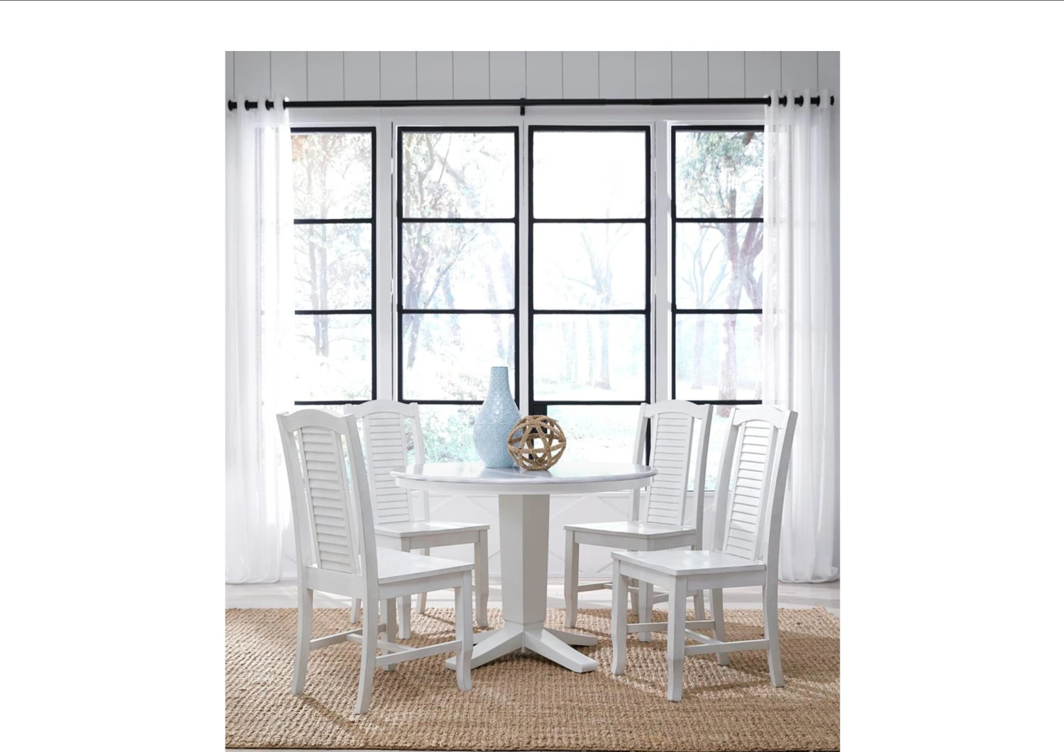 The Hampton Round Table features a half, bullnose edge with a curved top and a straight edge bottom. It includes the Aria Base which also adds a modern flair to this sturdy design. The table top ships in Chalk and the Aria base ships in White. The Seaside Chairs feature louvered backs, which add a subtle coastal touch. The tall back and wide seat offers excellent comfort. They ship in a Chalk finish. Furthermore, both the table and stools are available for separate purchase. Made from solid, eco-friendly Parawood, this set offers excellent strength and durability without compromising style.
