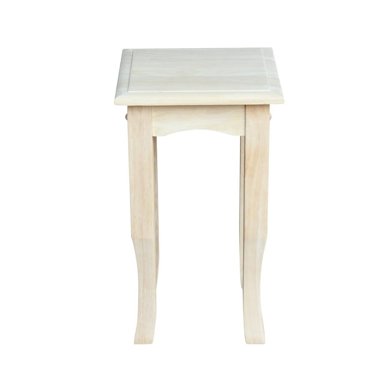 The Tall Tea Table features a beveled top and Bordeaux style legs. This table functions as a plant stand, a small end table, a corner accent table, or even a bedside table in a smaller bedroom. It’s small size allows for use in an apartment, dorm, or any other space where space is limited. In addition, the simple design and clean lines allow you to pair this table with any home decor. Made from solid, eco-friendly Parawood for strength and durability, the tea table offers excellent strength and durability. This table ships unfinished, but also easily stains or paints in order to match your existing furniture or to add a pop of color to your space.