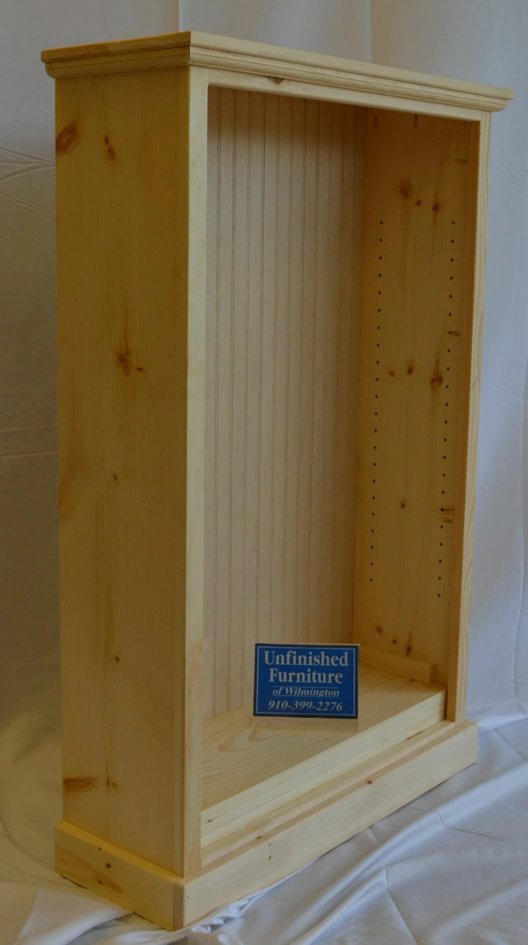 Constructed from solid Pine, it features a beadboard back and three adjustable solid shelves.